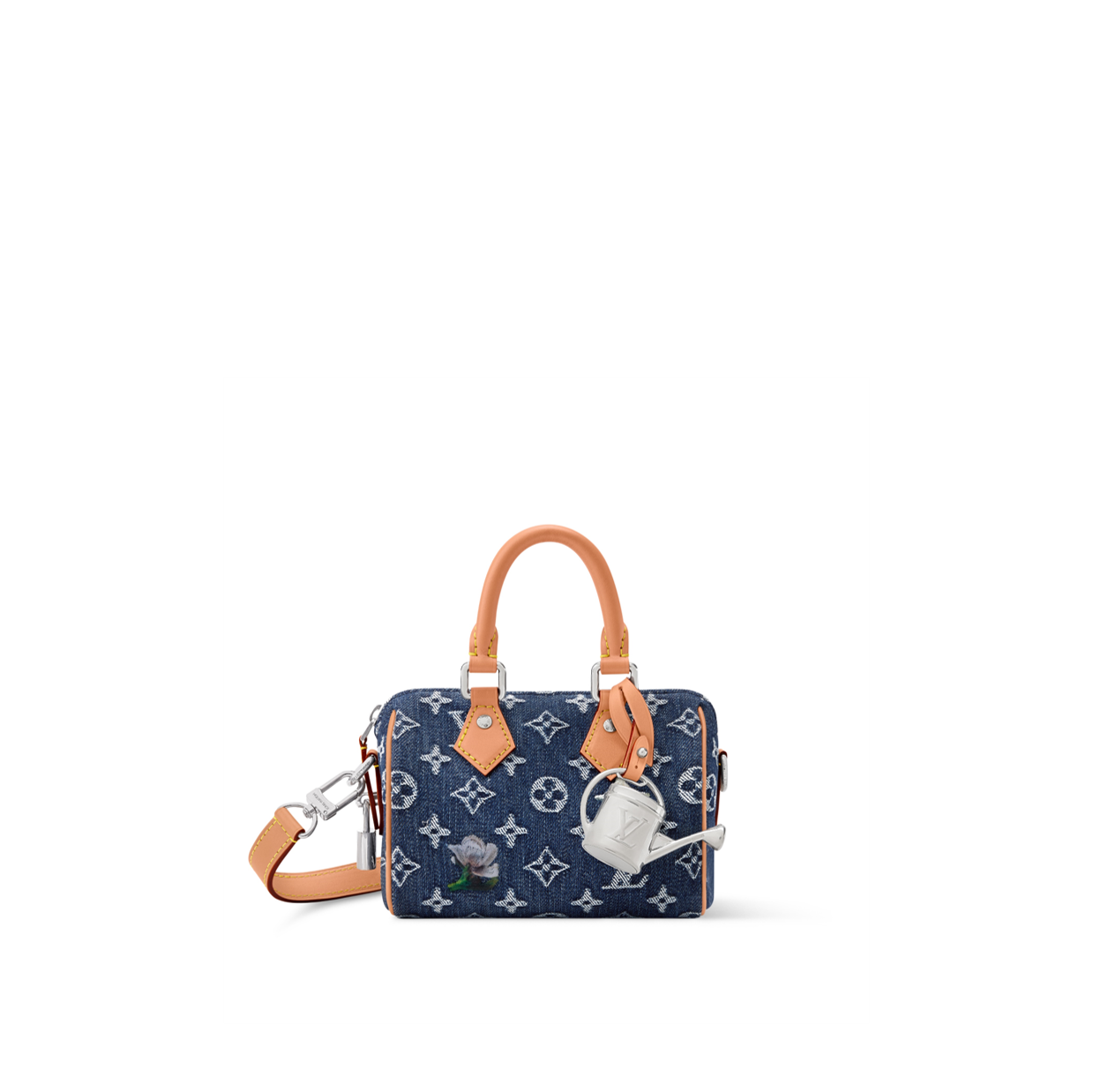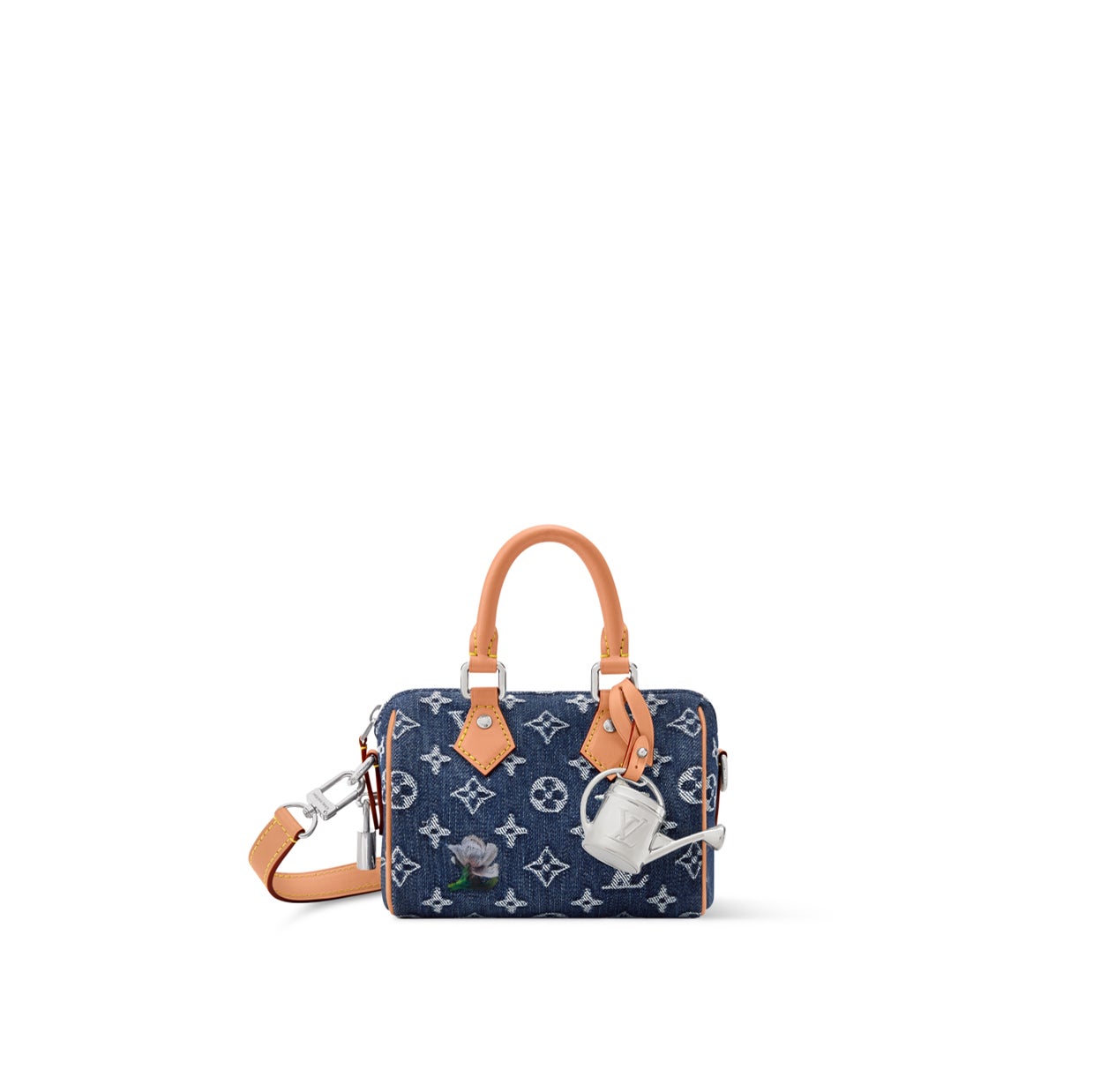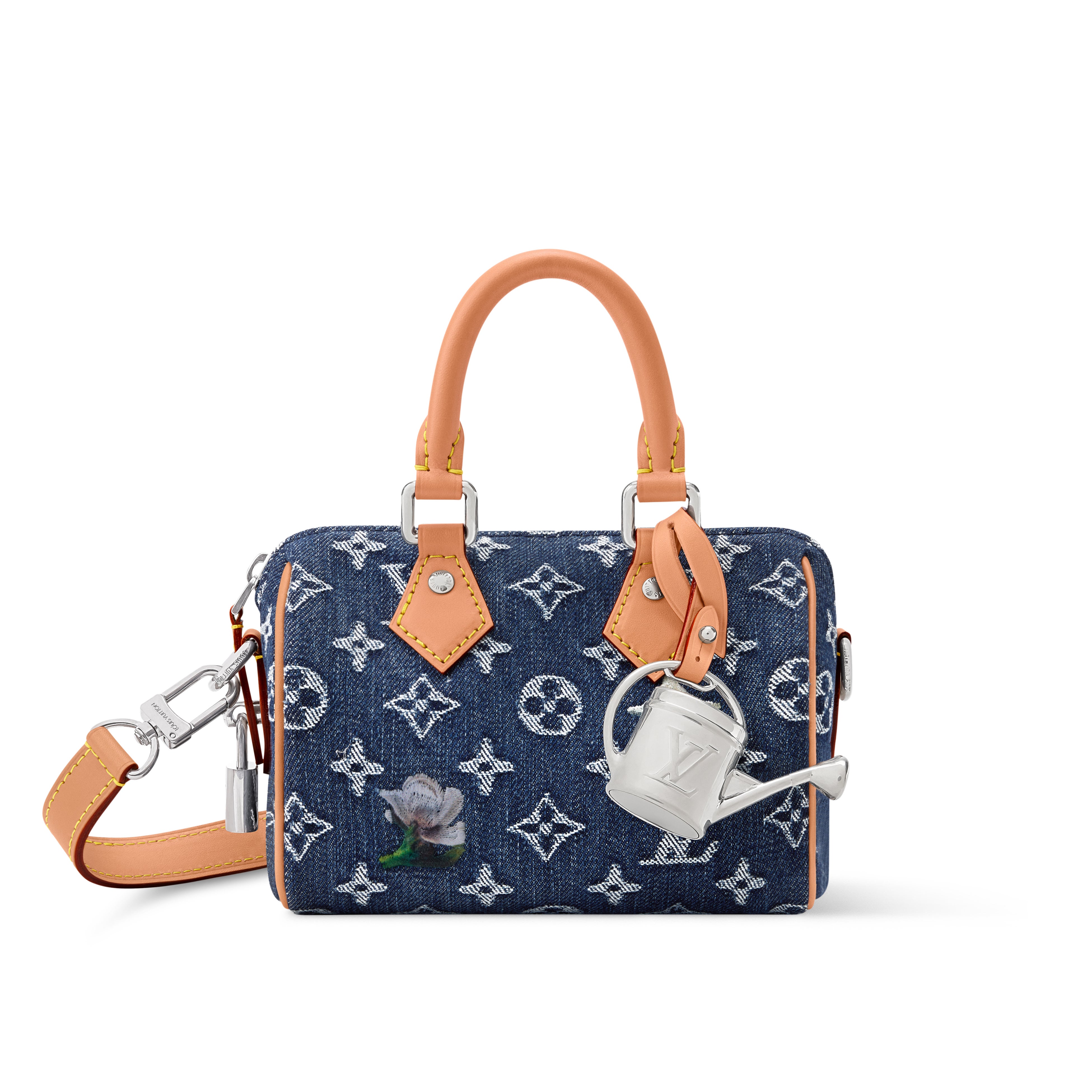 「スピーディ」ファミリーの中で最もコンパクトなサイズの「スピーディ·バンドリエール 18」。モノグラム·フラワー デニムにレザートリミングを施し、メタリックなジョウロのチャームで仕上げました。
