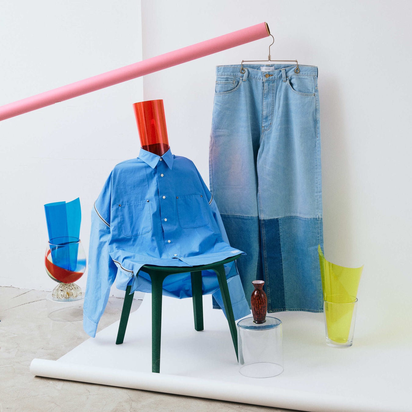 ブルー×ライトブルー、トーンの異なる生地を用いたシャツは、ジップが付いているので着こなしのアレンジ自在。今年らしいワイドなシルエットのデニムパンツと組み合わせて、春っぽいスタイリングに。