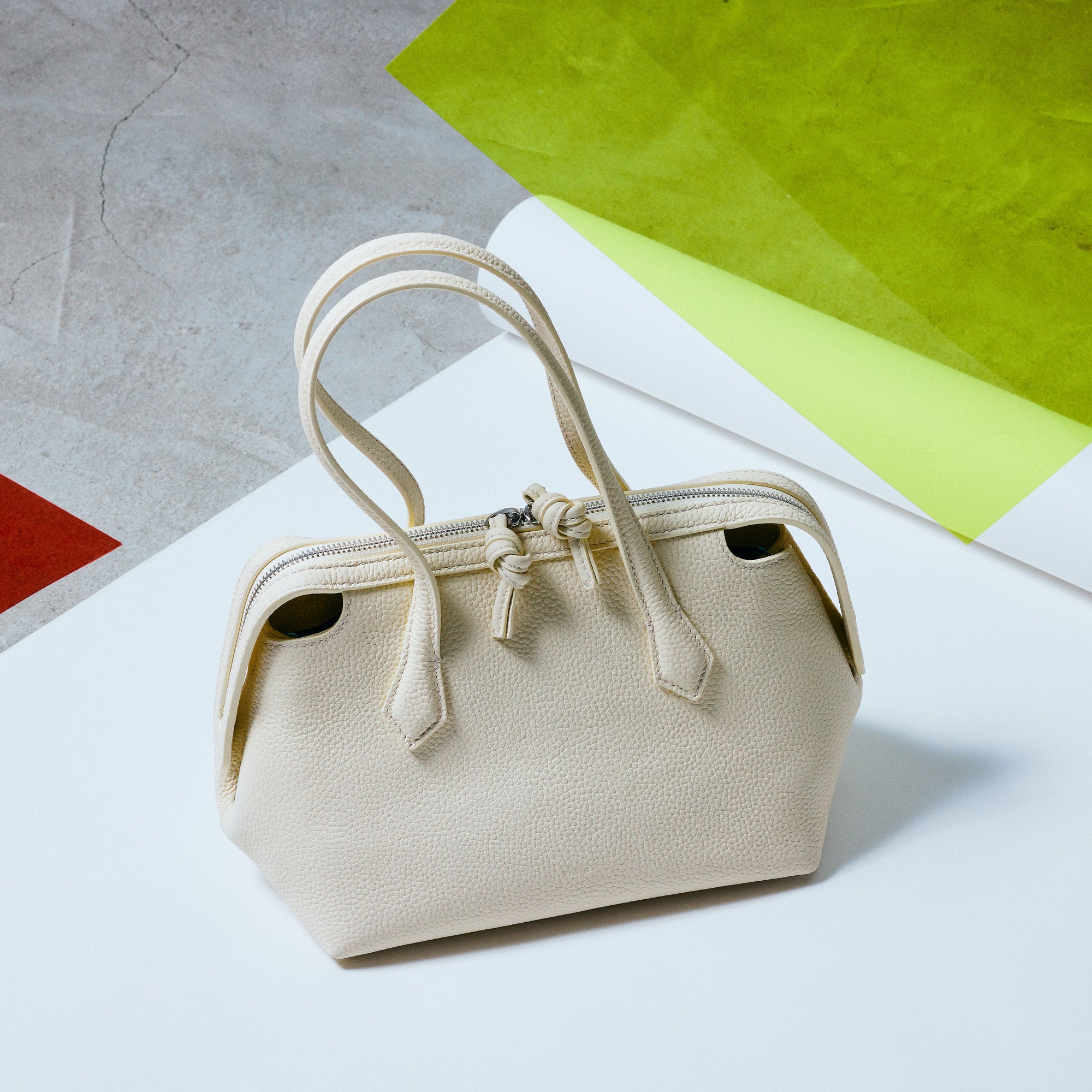 やわらかなアイボリーが春にぴったりなニューモデル。ボディは軽量で耐久性に優れたシュリンクレザーを使用し、ジップにあしらったレザーノットがアクセントに。間口が広く、使い勝手がいいのも魅力。通常の“MINI” サイズ、一回り小さい“MINI MINI”サイズの2種類を展開。