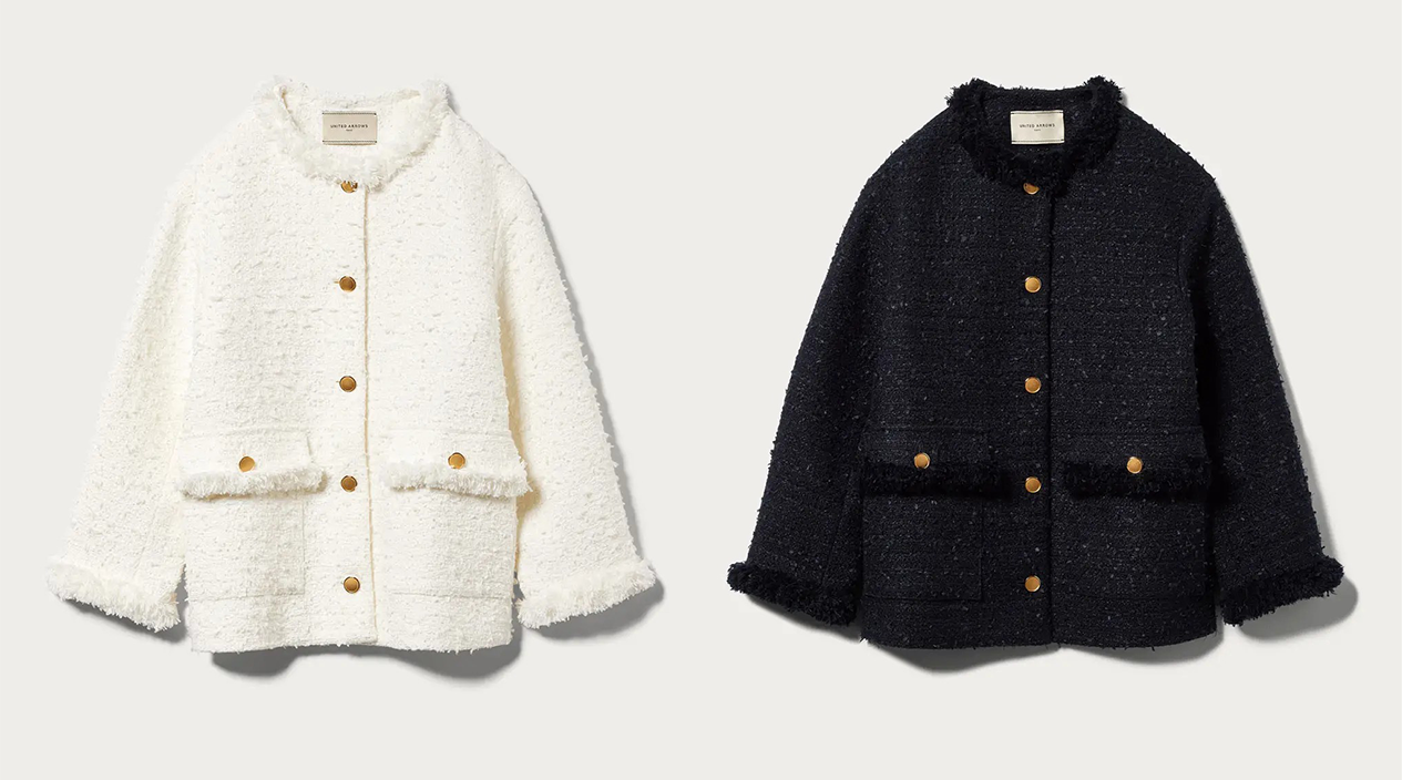 袖口とポケットのフラップ部分にあしらったボリュームのあるフリンジがおしゃれなノーカラージャケット。適度にゆとりのあるシルエットが、程よいリラックス感をアピール。
