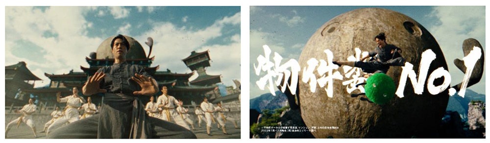 CMの舞台は壮大な山岳地に立つ武道の修行場。広場には多くの弟子を従えた桐谷さんが演じる師範とスーモが威風堂々とした姿でたたずんでいます。「SUUMOの全てを教えてしんぜよう」と気をためるようにゆっくりと構える桐谷師範。すると「チン!(賃貸)」の掛け声で、桐谷師範は素早く手を突き出し、続くスーモも「バイ!バイ!(売る・買う)」の掛け声でSUUMOオリジナルの形を見せます。さらに、桐谷師範は「リー!(リフォーム)」の掛け声と「ケンー!(建てる)」の掛け声でキレのある足技の形も披露。「住まい探し全部」の掛け声に「SUUMO!」と叫ぶ桐谷師範は、最後はスーモと一緒に飛び技を決めてくれました。『SUUMO』の機能を武道で表現するという意外な組み合わせを、桐谷さんの熱く力強いアクションで見せてくれます。