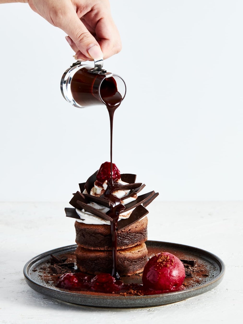 ホットチョコレートソースをかけると、さらに濃厚な味わいに。コーヒーとの相性も抜群で、甘くリッチなひとときをお楽しみいただけます。
