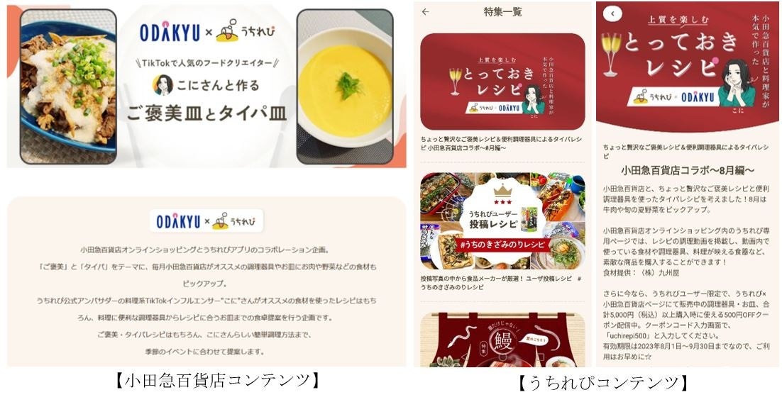 「小田急百貨店オンラインショッピング」で販売している肉や野菜などの食材を活用し、ハレの日や嬉しい時に家族で食べたいご褒美レシピや時間がない時でも美味しく作れるタイパレシピを「うちれぴ」が開発します。また、うちれぴ公式アンバサダーの「こに」(注4)が、開発したレシピ調理動画を「小田急オンラインショッピング」で販売している調理器具・食器を使って配信するなど、コラボレーションならではの食生活のトータル提案を図ります。両社のサービス上に特集コンテンツを設け、互いのユーザーの皆さまにご覧いただきながら、相互送客を図ることで両社の顧客接点拡大を目指します。さらに、「うちれぴ」アプリ上では、小田急百貨店オンラインショッピングうちれぴ特集ページ内で販売中の調理器具・食器、合計5,000円(税込)以上購入時に使える500円クーポンを、2023年8月1日~9月30日の期間限定でプレゼントします。