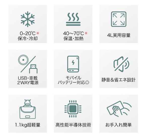 ※本製品はペルチェ式の冷温機能を採用しており、設定温度調整可能ですが、あくまで目安です。室温や使用する電源(特に電圧・電流)、収納する物の量・初期温度・形状などにより、実際の庫内温度や冷却・保温効果には差が生じる場合があります。安定した効果を得るためには、9V/2A以上の出力が可能な高性能モバイルバッテリー、または12V/3A出力の家庭用アダプターや車載ソケットでの使用を推奨します。また、急激な冷却・加熱機能はなく、安定的に温度を保つ仕様となっております。