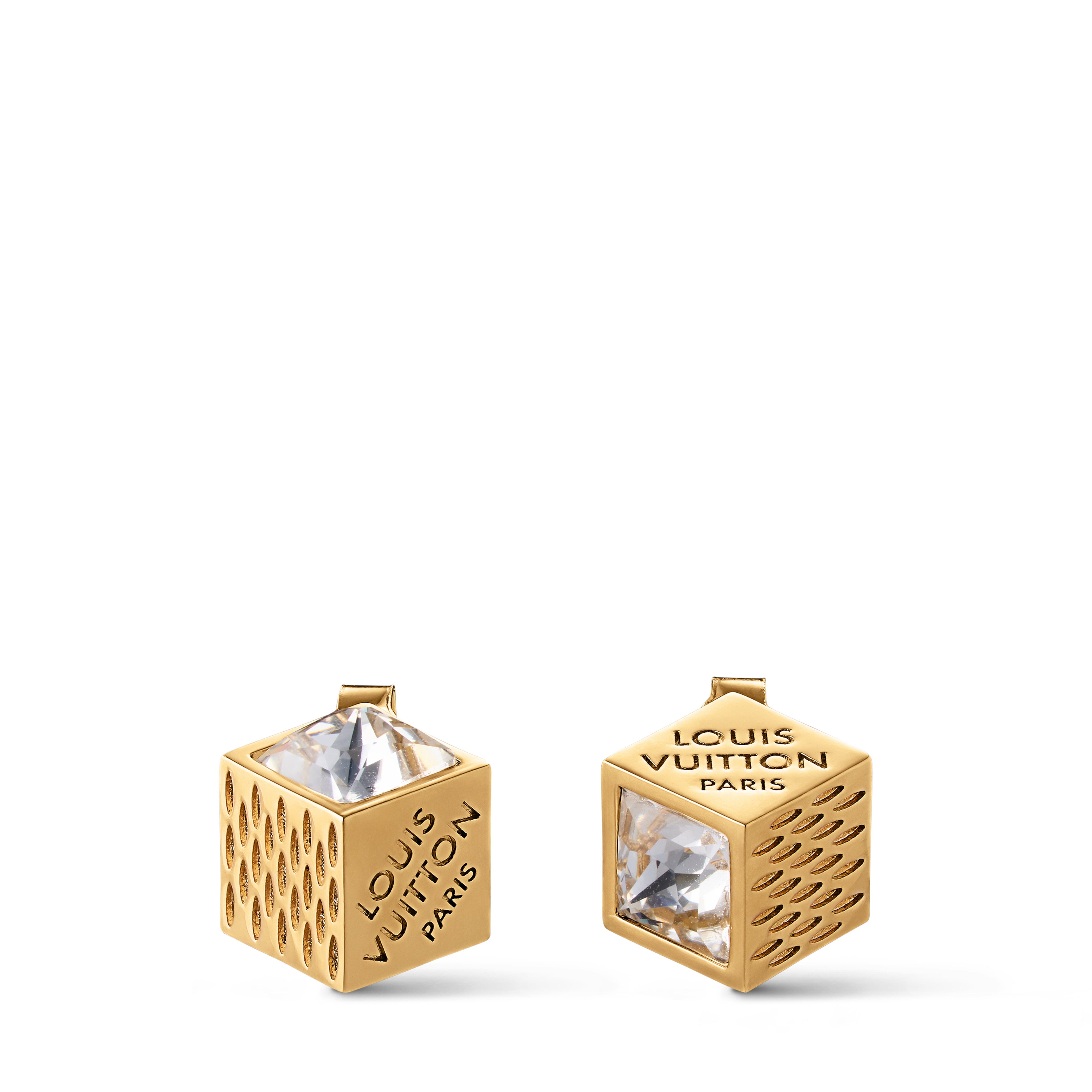 光沢感のあるゴールドカラーのメタルで仕上げた「ピアス・LV キューブ」。きらめくストラスと伝統的なダミエ·キャンバスを想起させる繊細な彫刻を施しました。アイキャッチーで個性的なアクセサリーを飾る「Louis Vuitton Paris」のシグネチャーも魅力。