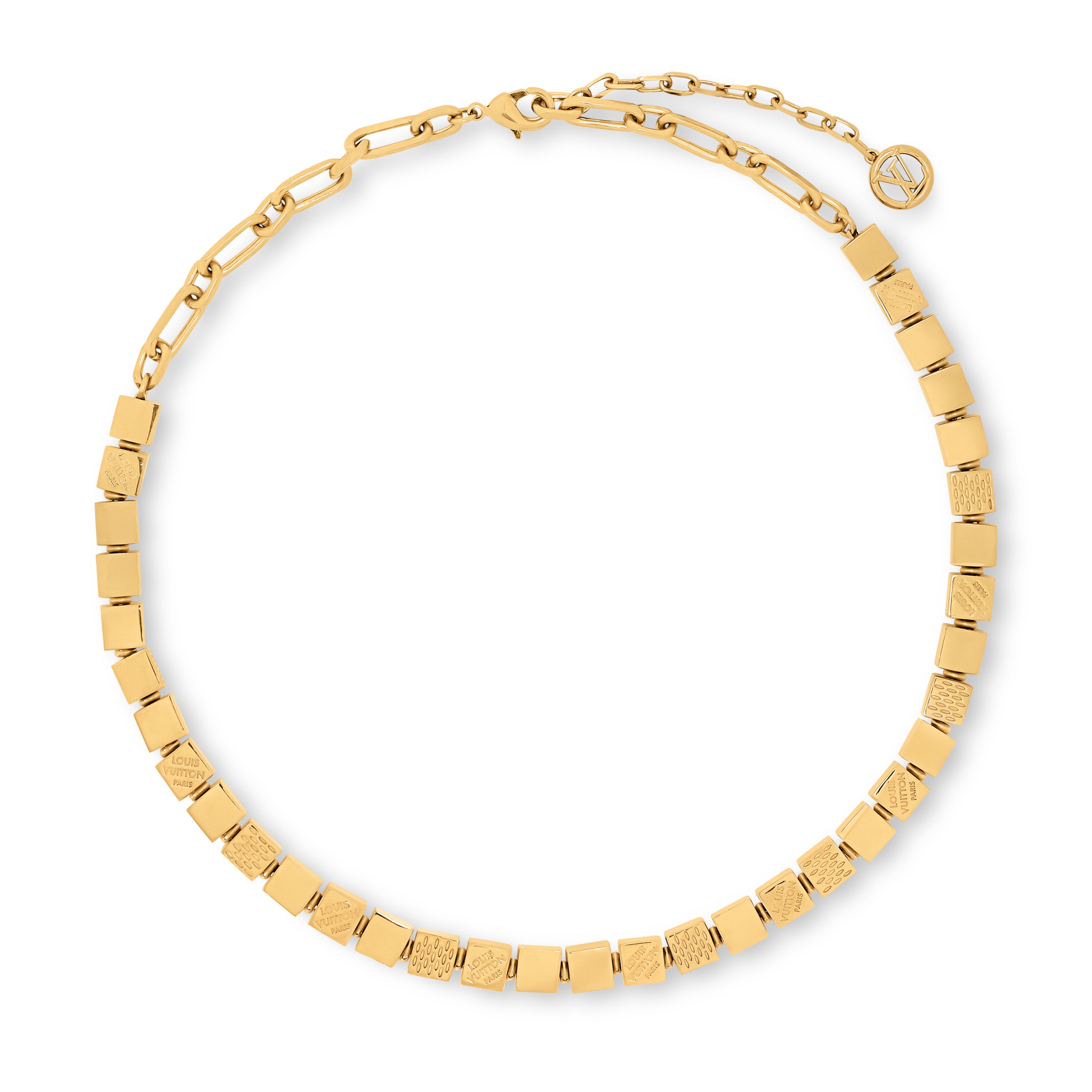 遊び心溢れるエレガントな「ネックレス·LVキューブ」。繊細に連ねたゴールドカラーのメタル製キューブには、ダミエ·キャンバスを想起させるストライプと「Louis Vuitton Paris」のシグネチャーが刻印されています。普段使いにも特別なシーンにも映える、洗練されたアイキャッチーな逸品。