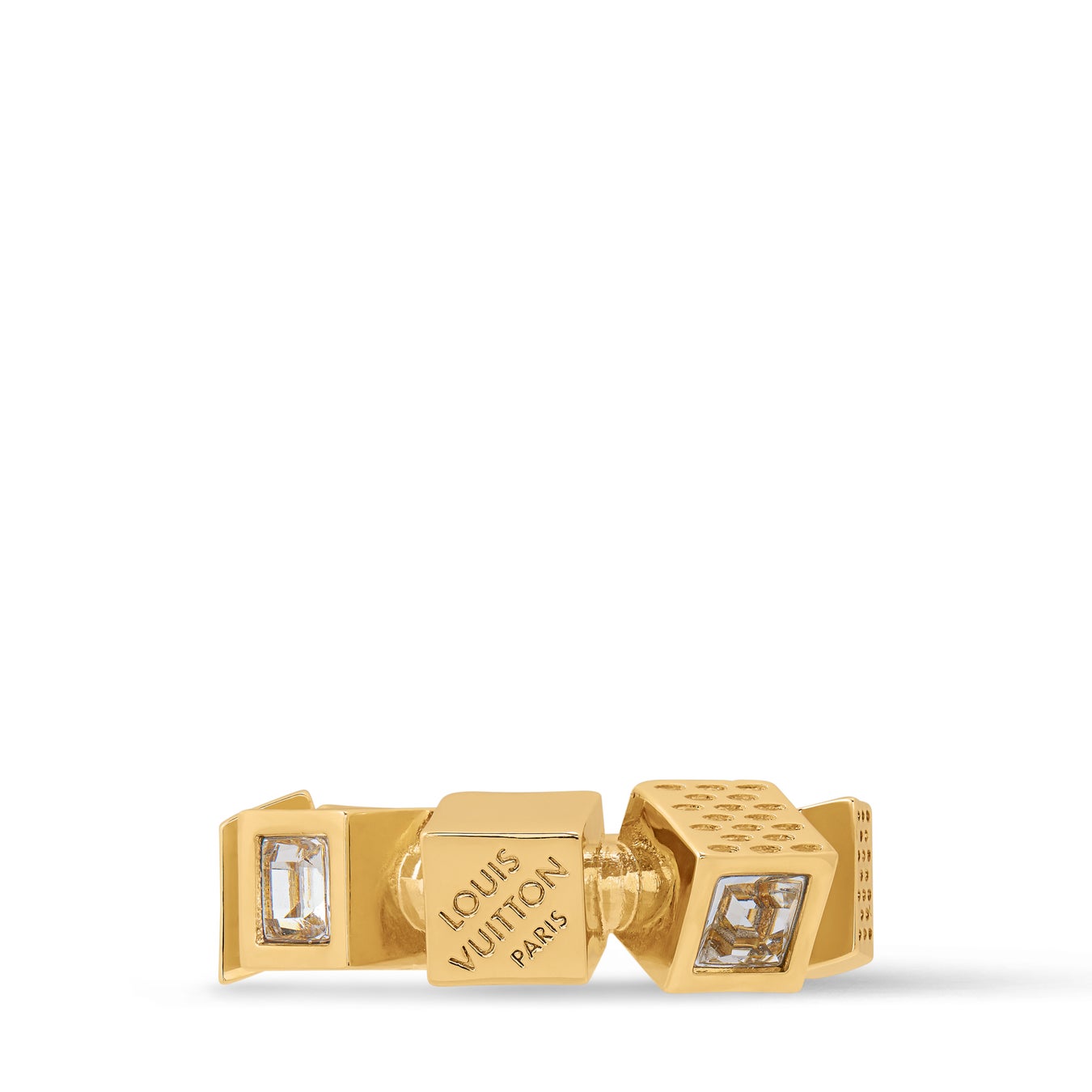 アイキャッチーな角ばったフォルムが魅力の「リング·LV キューブ」。ゴールドカラーのメタルバンドには、伝統的なダミエ·キャンバスを想起させるキューブが並び、繊細なラインや「Louis Vuitton Paris」のシグネチャーが刻印されています。きらめくストラスがグラマラスなアクセントを添える、魅惑的なリング。