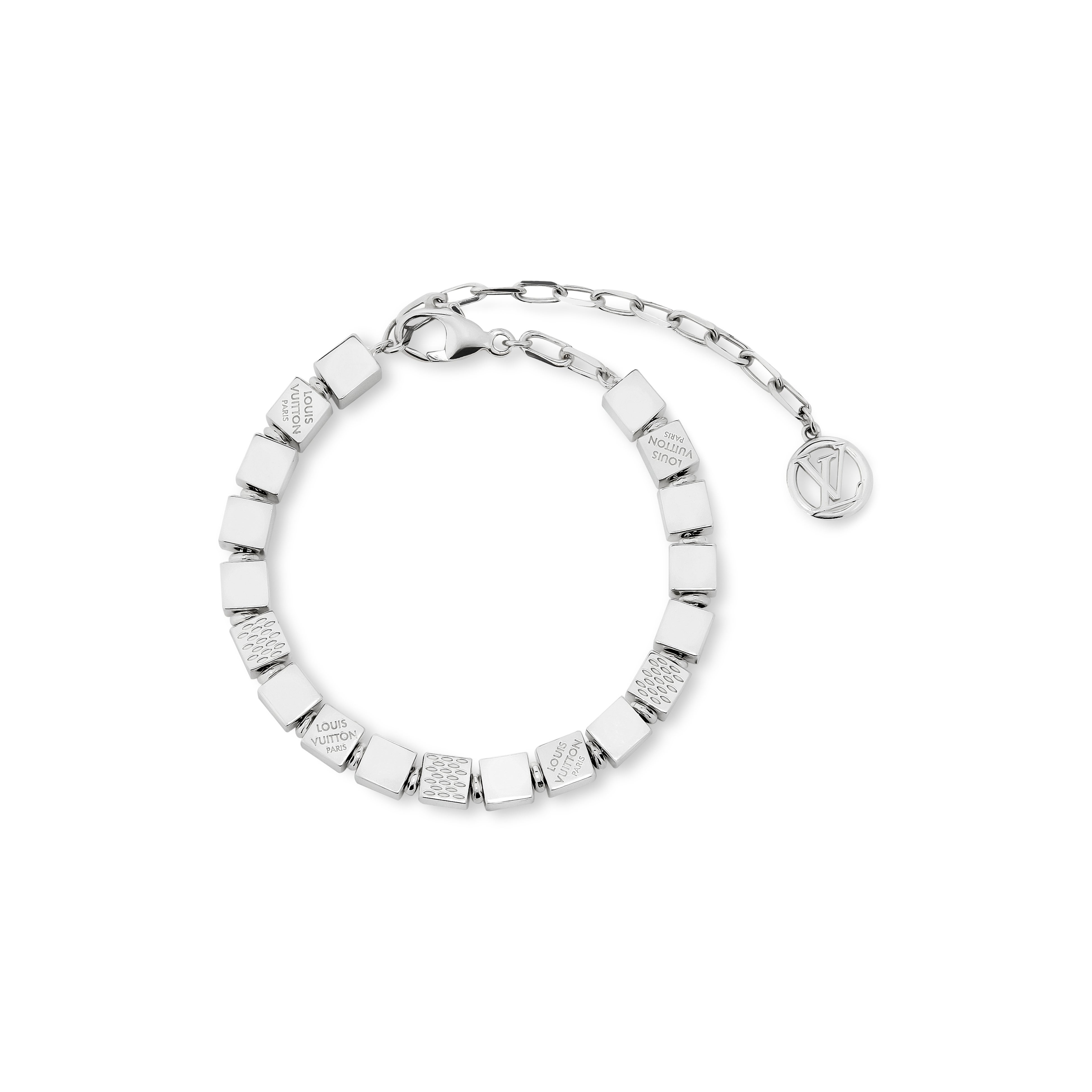 スターリングシルバー製の「ブレスレット·LV キューブ シルバー」。キューブ形のチェーンリンクには、キャンバス地の表面を表現したテクスチャーや「Louis Vuitton Paris」の刻印を施し、メゾンらしさを演出。遊び心とエレガンスを兼ね備え、あらゆる装いに個性を添えます。