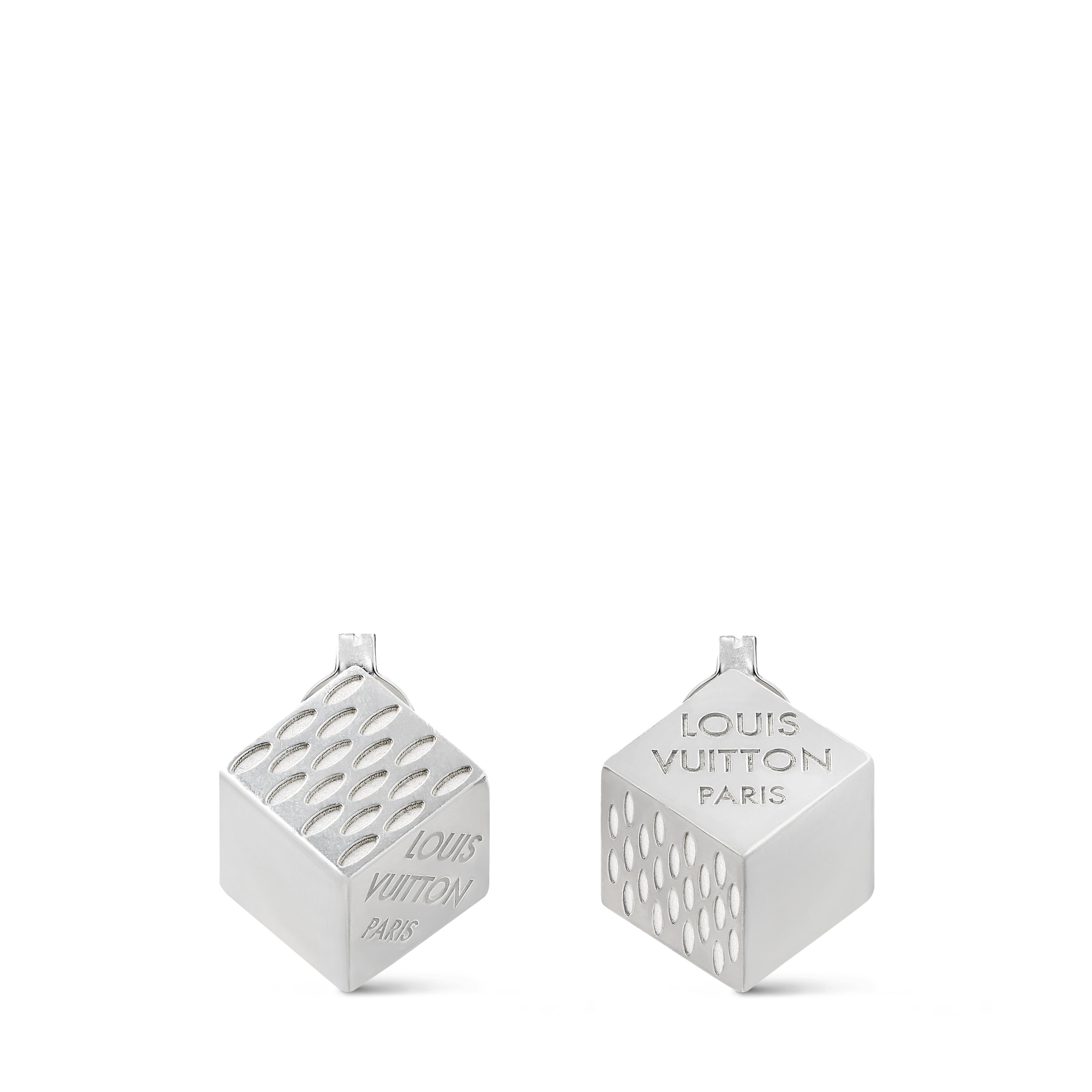 特徴的なデザインの「ピアス·LV キューブ シルバー」。ダミエのチェッカーボード柄をスターリングシルバー製のキューブで表現し、キャンバス生地を想起させるストライプと「Louis Vuitton Paris」のシグネチャーを精緻に刻印。あらゆる装いに洗練された遊び心を添える、アイキャッチーな逸品。