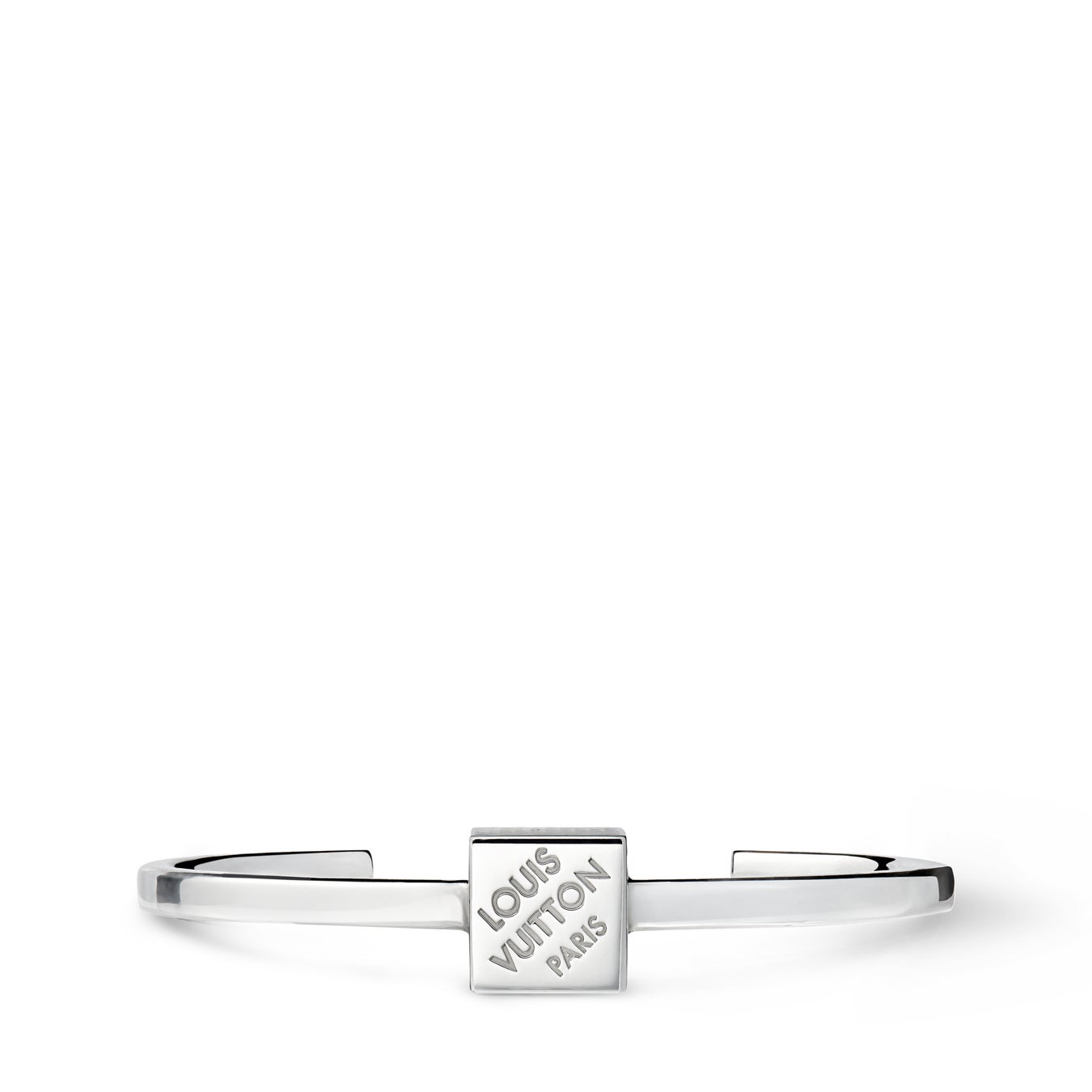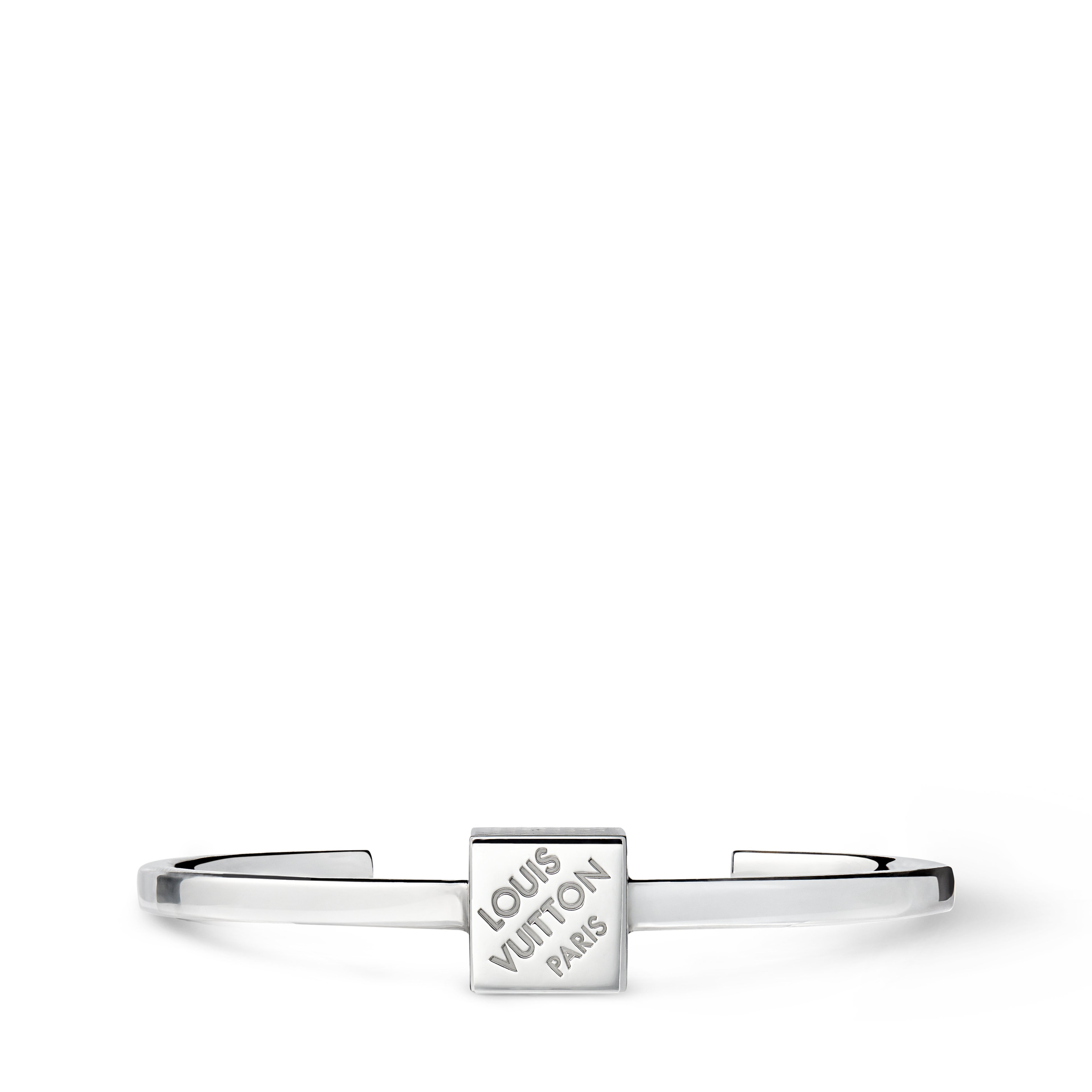 スターリングシルバー製の「ブレスレット·LV キューブ シルバー」。中央に配した精緻なキューブには、ダミエ·キャンバスを想起させる縞模様と「Louis Vuitton Paris」のシグネチャーが刻印されています。