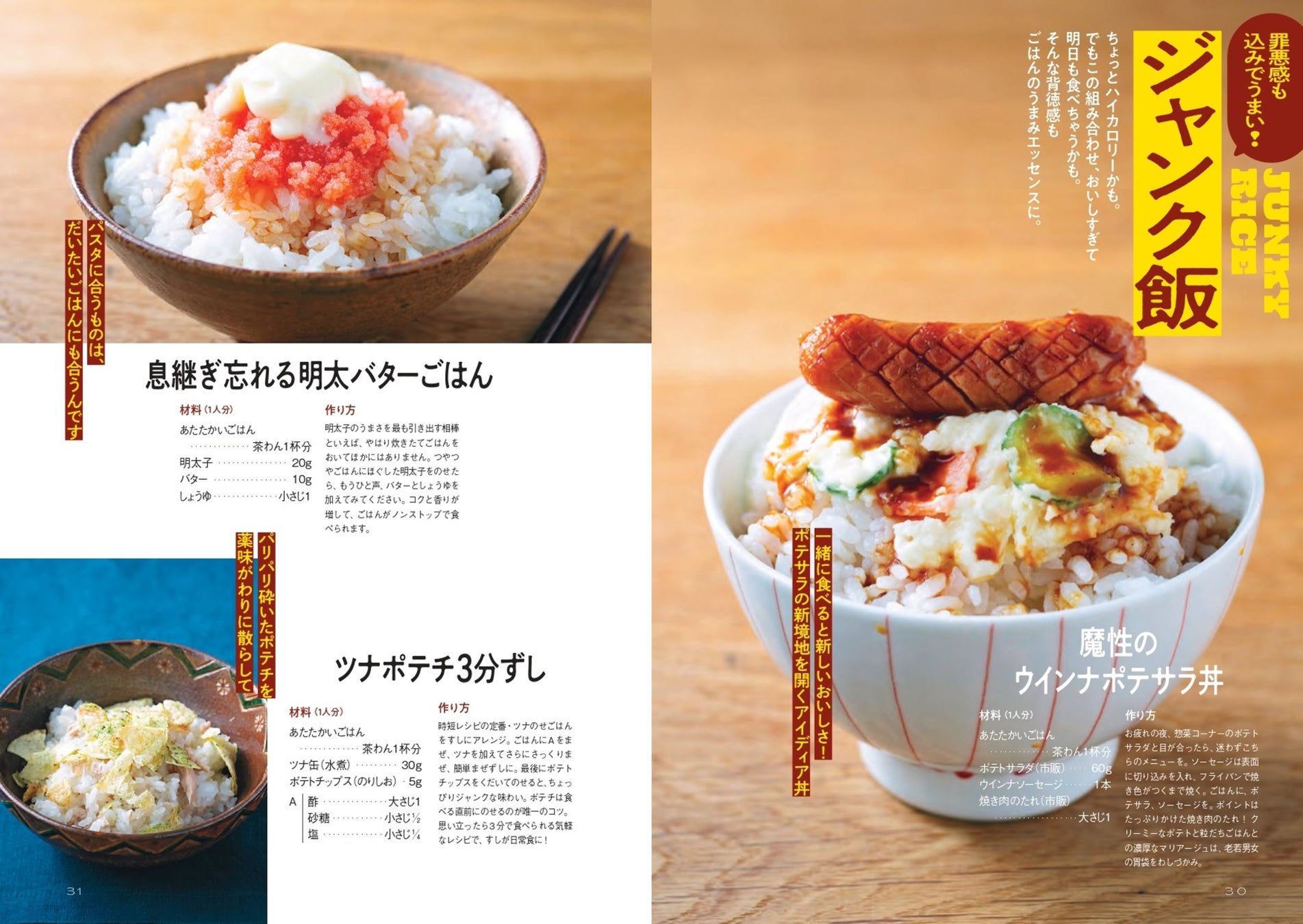 市販のポラサラに焼き肉のたれをかけ、ウインナをのせた「魔性のウインナポテサラ丼」、ドレッシングと溶き卵を加えただけの「玉ねぎドレッシングde3分チャーハン」など、あるもので作れるのに大満足なジャンク系レシピも。
