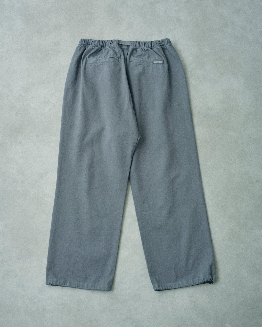 製品染めとバイオウォッシュを施すことで、ヴィンテージライクな風合いと奥行きのある表情を表現しています。シルエットは裾幅を大きく調整し、リラックス感のあるワイドフィットにアップデート。ラフさがありながらも、都会的なムードを纏うバランスに仕上げています。Gramicciのアイコンであるガゼットクロッチやウェービングベルトといった機能的ディテールはそのままに、relumeらしい洗練されたデザインアプローチを融合。バックポケットの刺繍やベルトロゴはボディと同色でまとめ、さりげないアクセントとして効かせました。また、気の利いたベルトループを追加することで、キーホルダーやウォレットチェーンを装着でき、自分らしいアレンジで個性を演出しながらファッションを楽しめる仕様に。裾にはドローコードを配置し、シルエットの変化も楽しめます。機能性とファッション性、そしてサステナブルな素材選定。今の時代に、ファッションを再燃させる一本です。