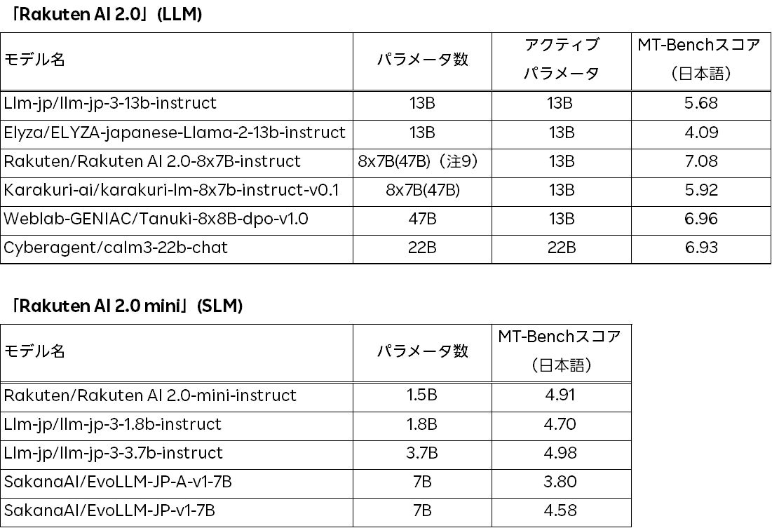 楽天グループ株式会社(以下「楽天」)は、Mixture of Experts(MoE)(注1)アーキテクチャを採用した新しい日本語大規模言語モデル(以下「本LLM」)「Rakuten AI 2.0」と、楽天初の小規模言語モデル(以下「本SLM」)「Rakuten AI 2.0 mini」の2つのAIモデルを本日提供開始しました。2024年12月に発表した両モデルそれぞれについて、基盤モデル(注2)と同モデルを基にしたインストラクションチューニング済モデル(注3)を提供します。全モデルは、Apache 2.0ライセンス(注4)で提供されており、楽天の公式「Hugging Face」リポジトリ(注5)からダウンロードすることができます。