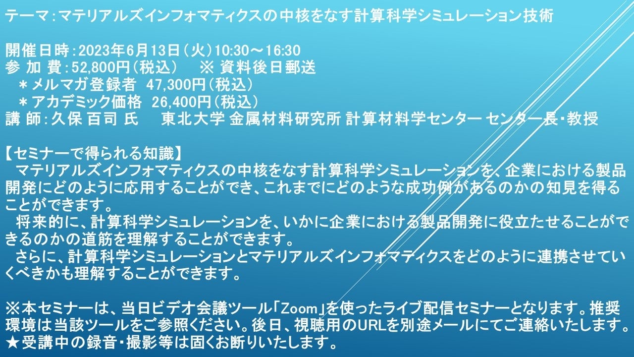 【ライブ配信セミナー】マテリアルズインフォマティクスの中核をなす計算科学シミュレーション技術 6月13日(火)開催 主催:(株)シーエムシー・リサーチ