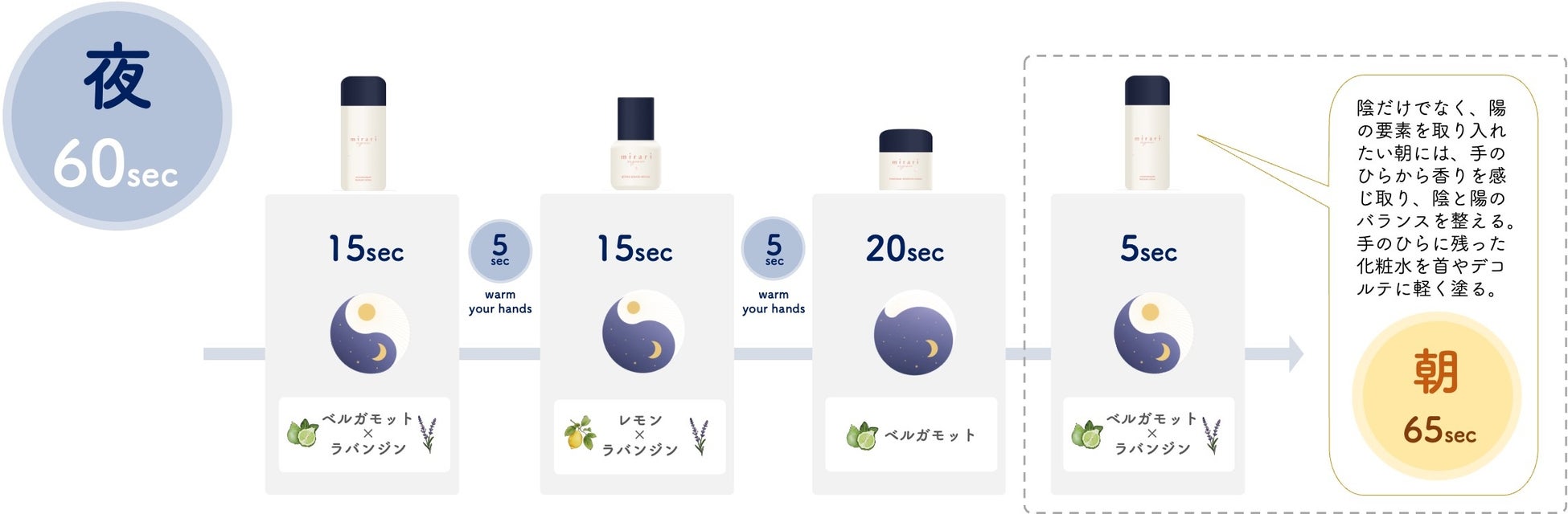 陰の時の自分にまで手を伸ばしてくれるスキンケア。誰にでも自身の中に「陰」と「陽」の側面が存在するという考えをもとに、陰の時の自分にまで手を伸ばしてくれるスキンケアを開発。英語で「陰」はnegative、「陽」はpositiveと表現しますが、mirariとしては、negativeは悪い感情ではなく、negativeな時を大事にすることにより、人はより強くなれるという想いのもと、コンセプトを設定。