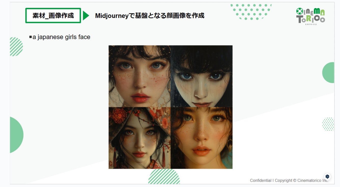 MIdjourneyにて「a japanese girls face」というプロンプトで生成してもらいます。