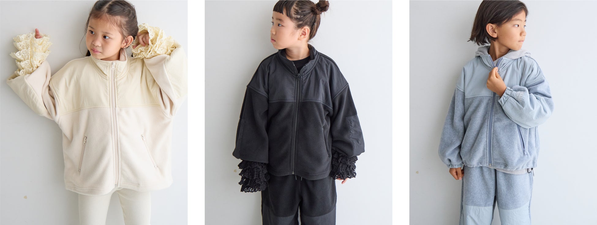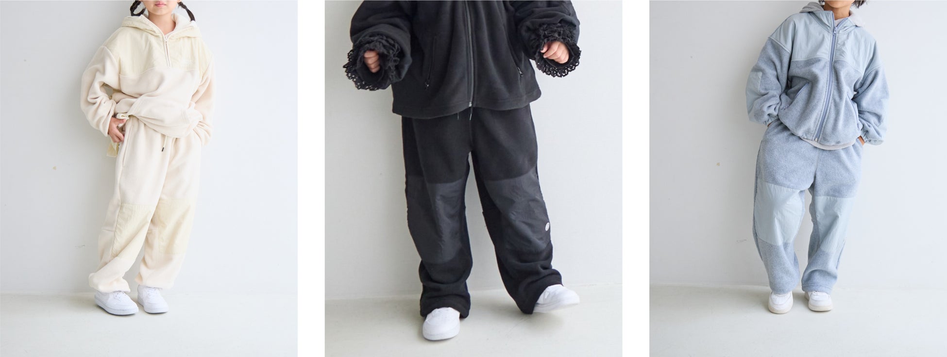 今回の別注アイテムは、スポーティーなフリース素材をモノトーンでまとめた温かみとクールさを併せ持つシリーズです。トレンドとして注目され続けている “アクティブウェア” にLOWRYS FARMが得意な “カワイイ” のエッセンスを加え、スポーティー過ぎず、ファッションとしてより楽しめるような新しいスタイルを提案。メンズライクなアイテムにガーリー要素をプラスしたような、ハイブリッドディテールがポイントの楽しいアクティブウェアで、レディースアイテムとキッズアイテムの計8型を展開します。冬に優しい白のワントーンコーデが一押しのスタイリングです。