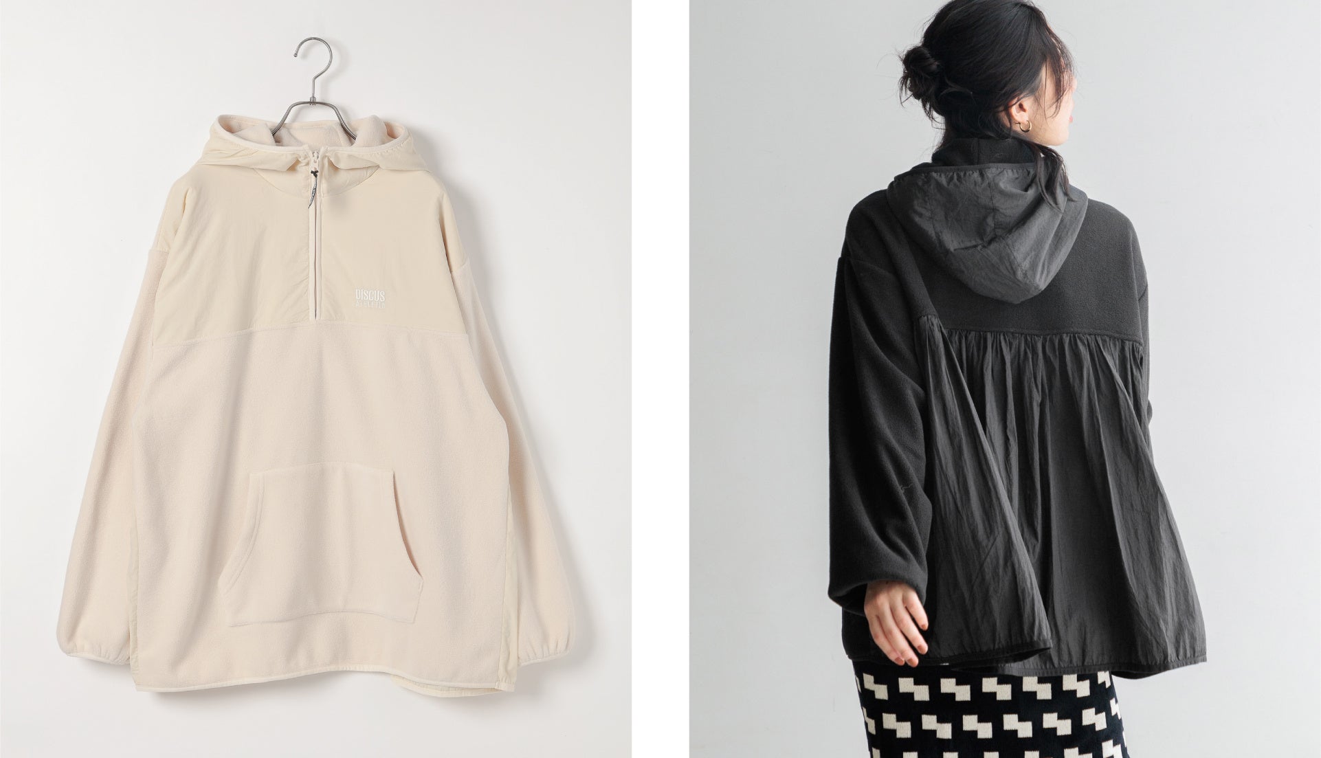 バックスタイルにギャザーをあしらった、ハーフジップフーディ。カワイイとカッコいいを組み合わせたハイブリッドな1枚。