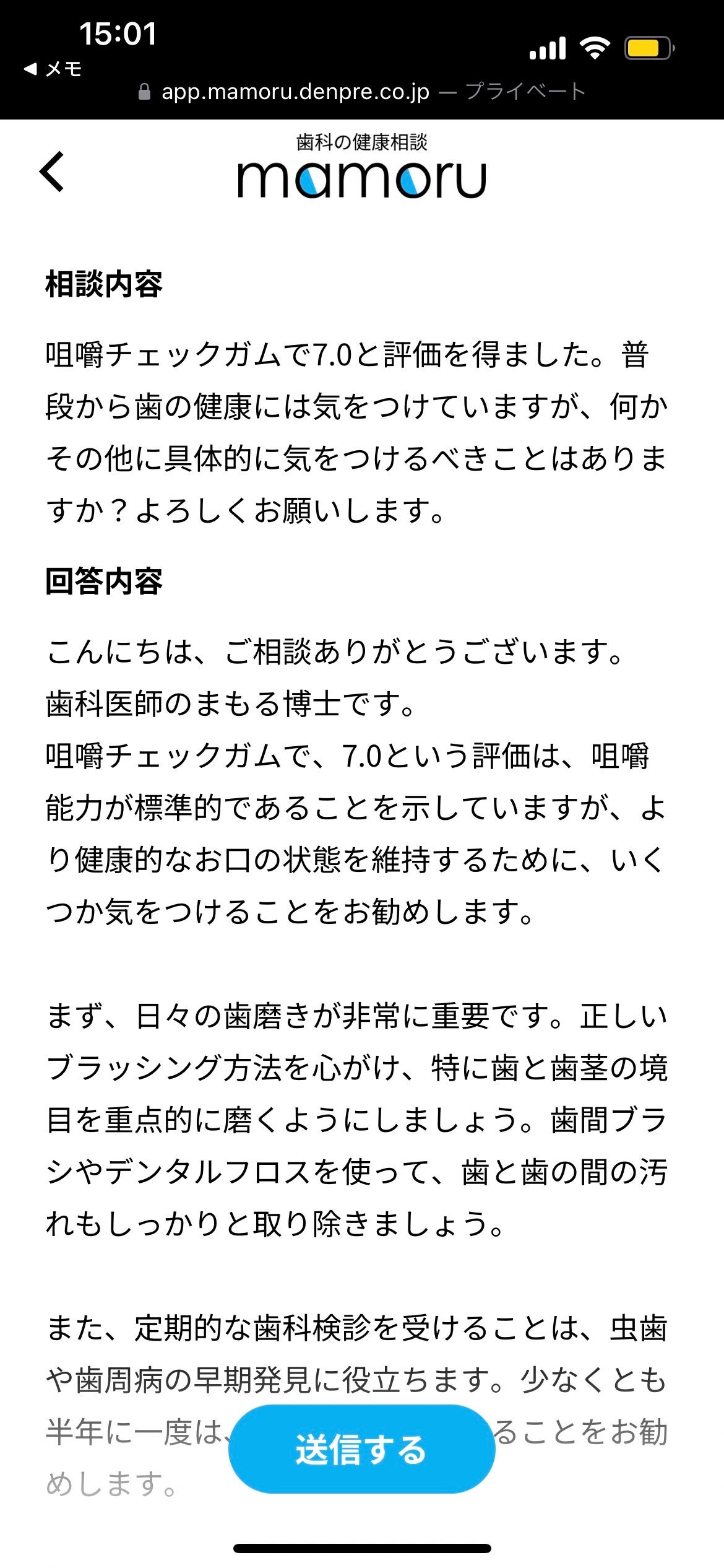 「歯科の健康相談 mamoru」アプリは時間や場所を問わず、スマホやタブレット端末で気軽に歯科医師に相談したり、最寄りのクリニックを予約したりすることのできる無料のアプリサービスです。