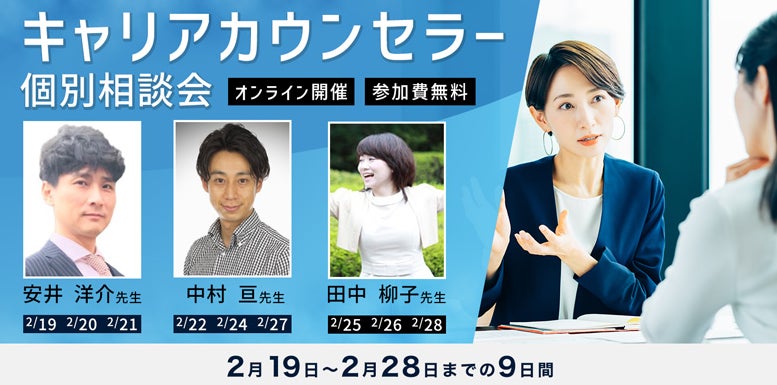 個別相談会では、安井 洋介氏、中村 亘氏、田中 柳子氏が、それぞれ3日間ずつ、約30分程のキャリアカウンセリングを実施いたします。「計画的偶発性理論」「プロティアン・キャリア」「認知行動療法」。豊富な知識とご経験をお持ちの3名が、VUCAの時代でも不安に押しつぶされることなく、しなやかにキャリアを歩めるようアドバイスいたします。なお、本個別相談会は、C&R社会員限定のイベントです。まだ、ご登録をされていない方でも、お申し込み前にご登録いただくことで、ご参加いただけます。「どのような経験や実績に自信を持って良いのかわからない」「キャリアや技術はあるのに、自分が思い描く働き方ができていない」「これまでのキャリアを振り返る機会をつくりたい」など、ご興味をお持ちの方はぜひご参加ください。