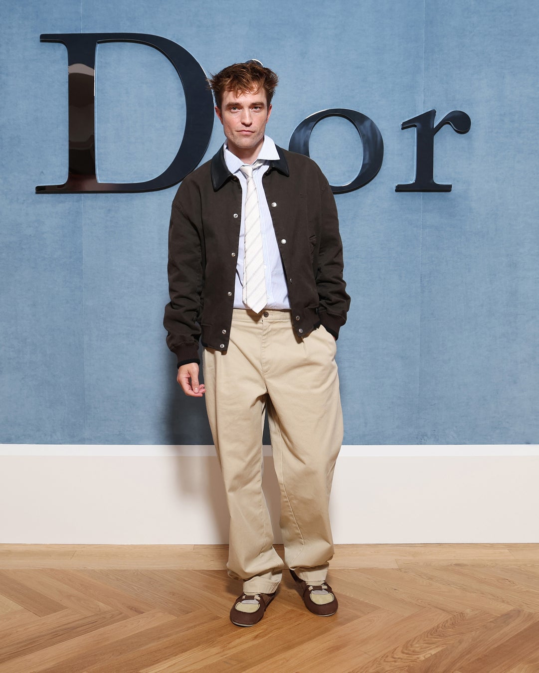 ロバート・パティンソンはブラウンウールのボンバージャケット、ライトブルーとホワイトのストライプのコットンシャツ、ホワイトとグレーのシルクタイ、ベージュのプリーツパンツ、ブラウン&ベージュのスエードスニーカーを着用しました。