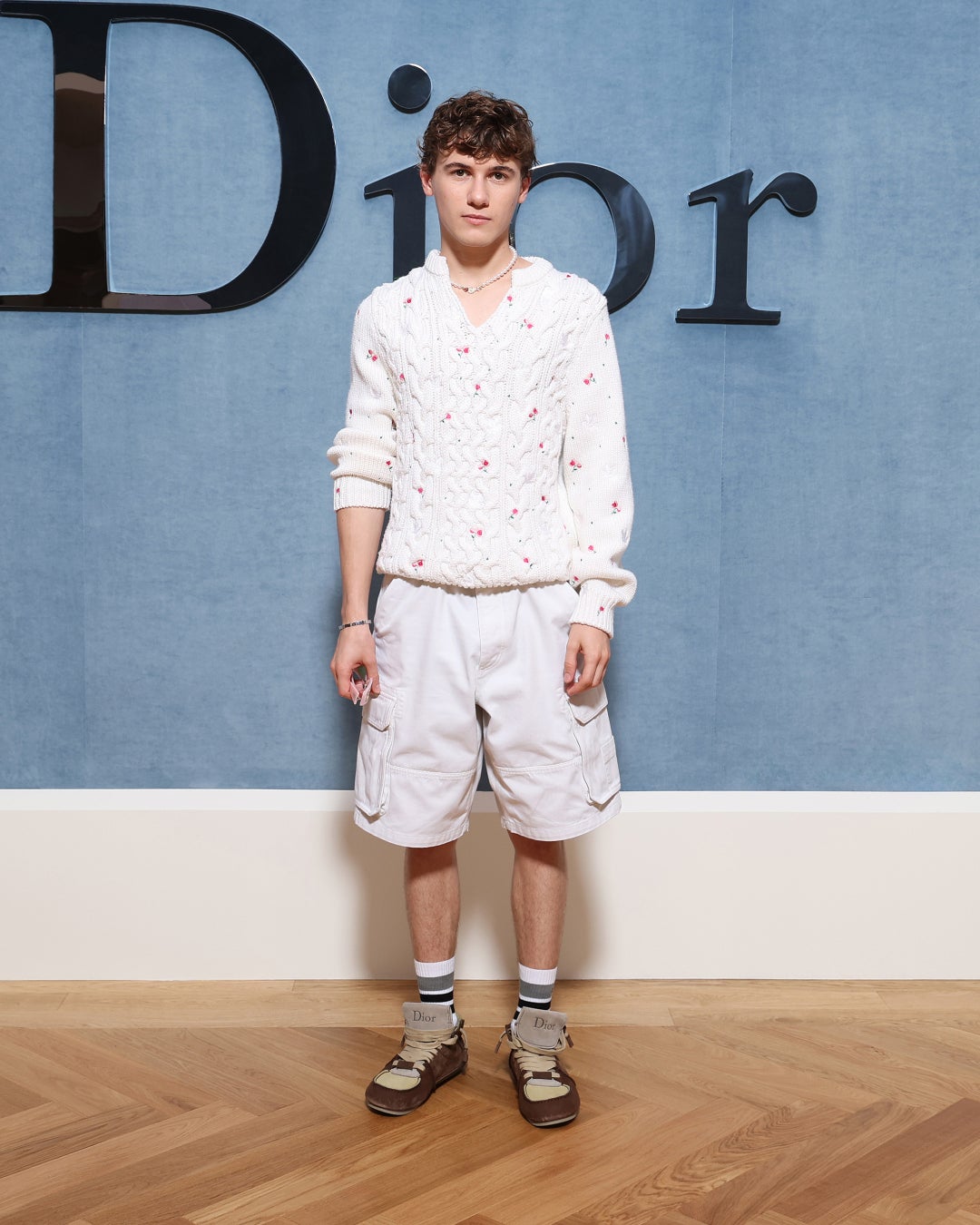 サム・ニボラはピンクの花の刺繍が入ったホワイトのケーブルニット ウール セーター、ホワイトのデニムショートパンツを纏いました。また、グレーのレザーベルト、ホワイトパールとホワイトゴールドのネックレス、ホワイトゴールドのジェムブレスレット、ピンクのサングラス、ホワイト、ブラック、グレーのソックス、ブラウン&ベージュのスエードスニーカーを合わせたルックを披露しました。