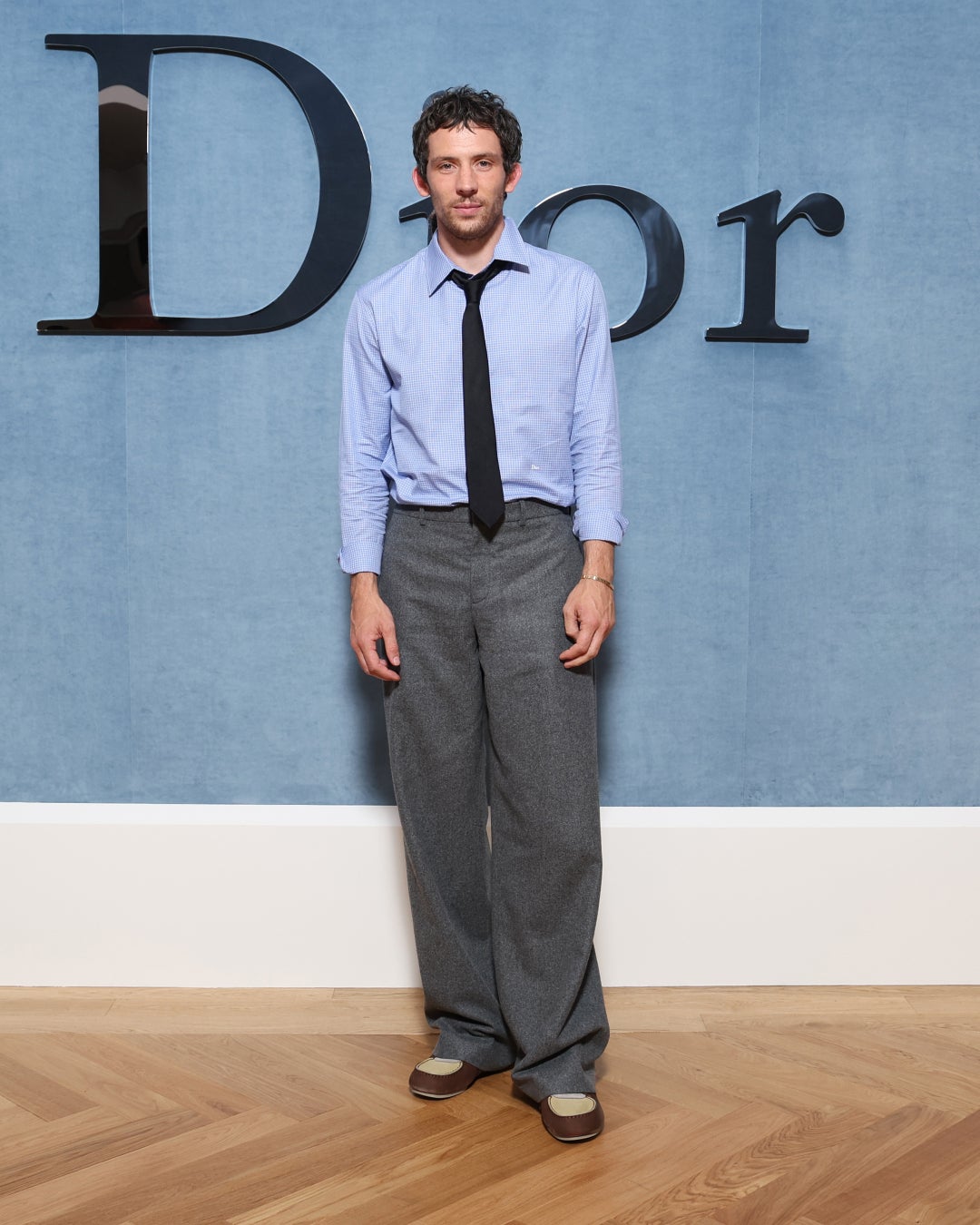 ジョシュ・オコナーはブルーチェックのコットンシャツにブラックのシルクタイ、グレーのウールパンツ、ブラウン&ベージュのスエードスニーカーを着用しました。