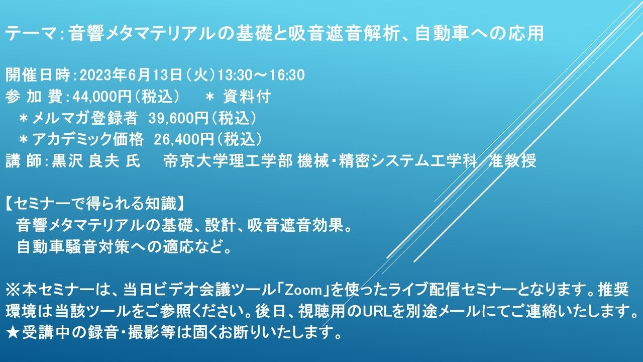 【ライブ配信セミナー】音響メタマテリアルの基礎と吸音遮音解析、自動車への応用 6月13日(火)開催 主催:(株)シーエムシー・リサーチ