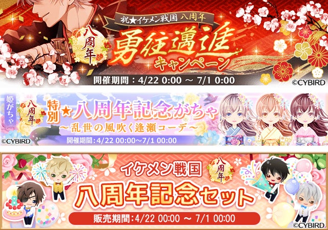 「祝☆イケメン戦国八周年 勇往邁進キャンペーン」では、条件クリアで「八周年記念のミニキャラ」を獲得できる企画や、「本編1話まるごと公開」などを実施しています。