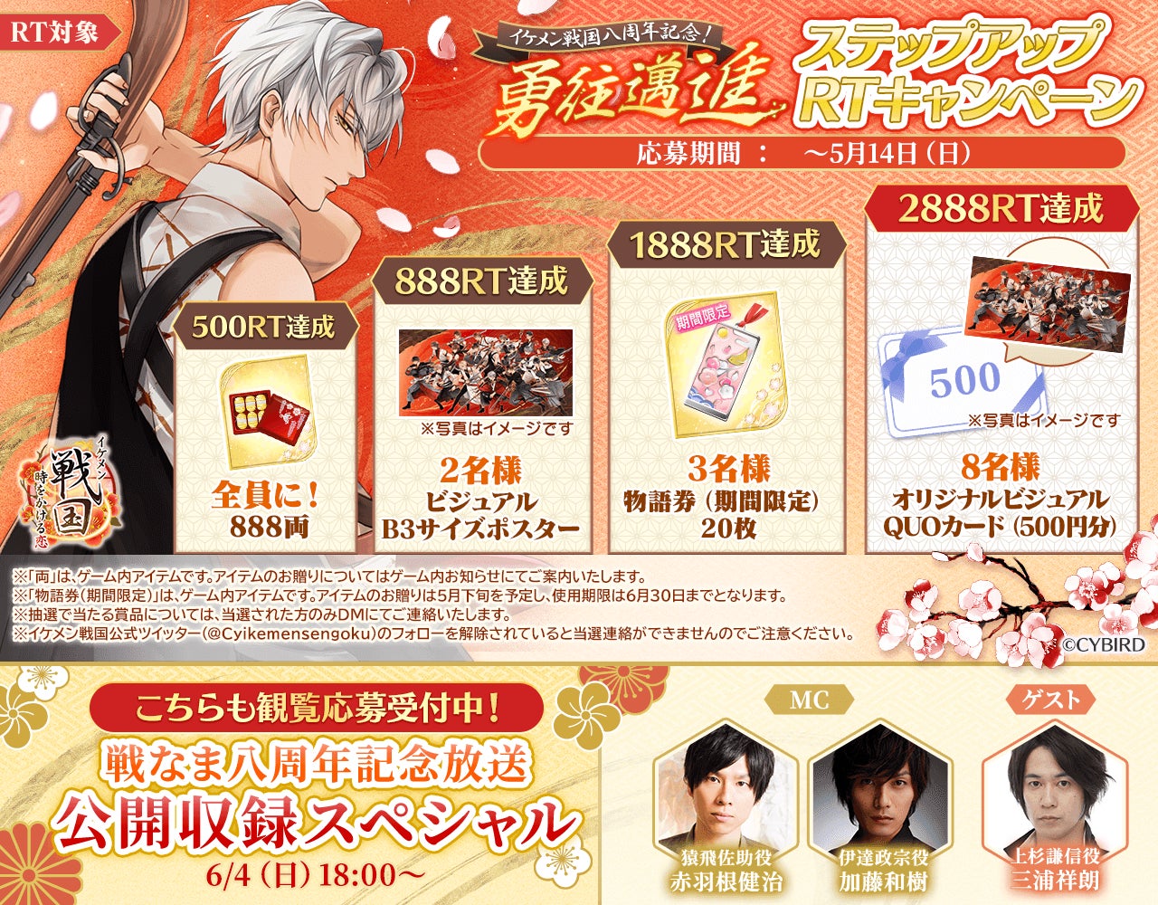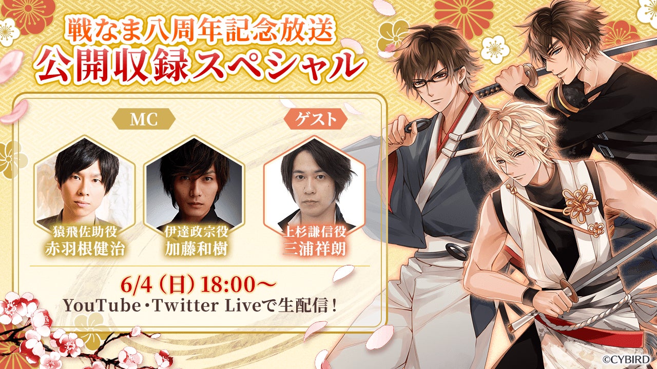 番組MCとして、「猿飛佐助」役の赤羽根 健治さん、「伊達政宗」役の加藤 和樹さん、さらにゲストとして「上杉謙信」役の三浦 祥朗さんをお迎えします。会場に来られない方も、YouTube、Twitter Liveにて配信するので、一緒に『イケメン戦国◆時をかける恋』の八周年をお祝いしましょう!
