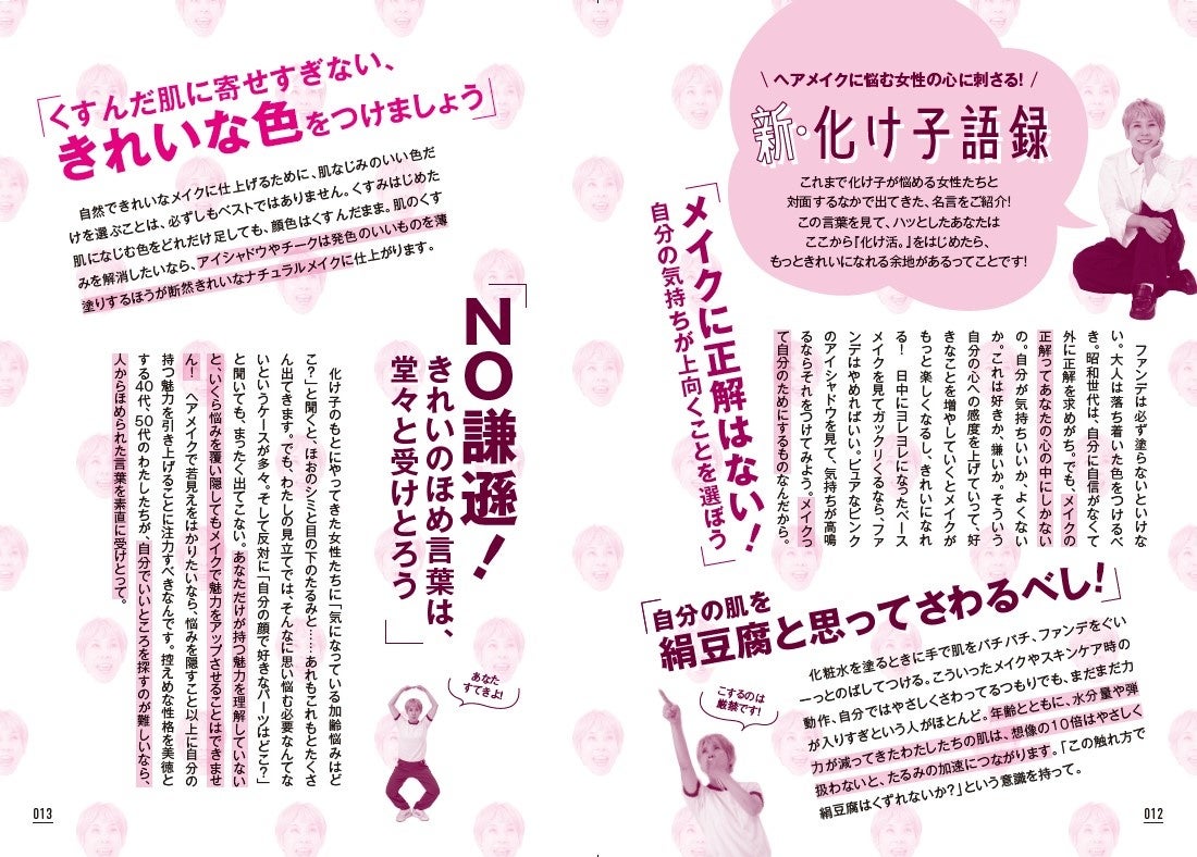 化け子人気を語るうえではずせないのが、揺らぎがちな40代50代女性のメンタルに寄り添うモチベーショナルスピーカー(別名・名言製造機)としての一面。自身も立派なシワ、シミ、たるみをもつおばちゃんサンプルとして、惜しげなくすっぴんを披露する彼女が本書籍に込めた思いは、“40代・50代以上の加齢事象に悩むすべての女性をメイクテクニックで笑顔にする”こと。大人だから共感できる大人のための名言と、メイクが楽しくなるコツが満載の仕上がりになっています。