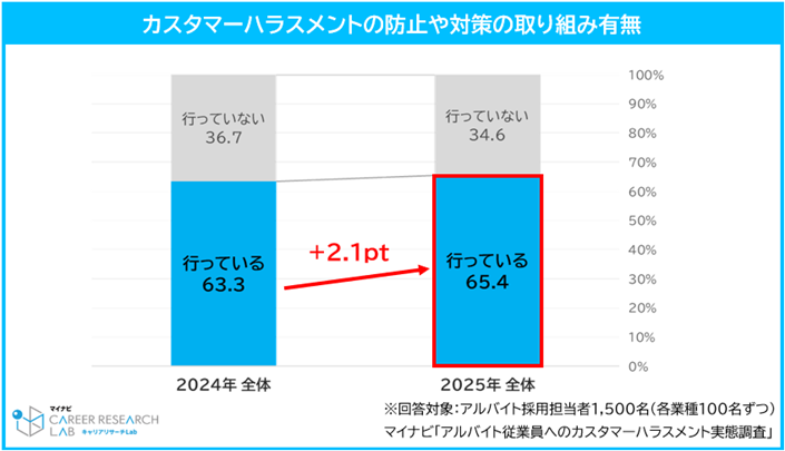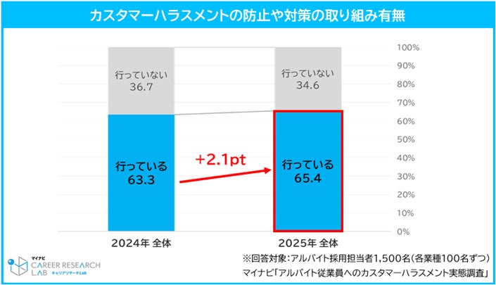 カスタマーハラスメントの防止や対策に向けた取り組みを行っている企業は65.4%となり、前年(63.3%)から2.1pt微増した。一方で、「行っていない」割合は34.6%と依然として3割を超える。
