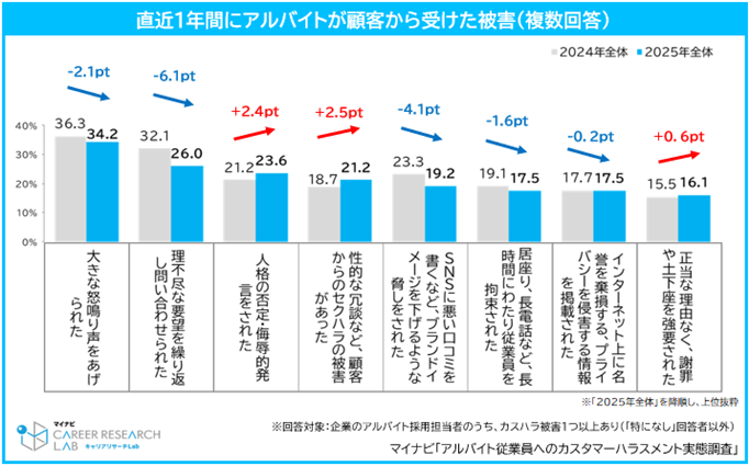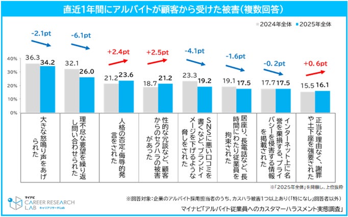 一方で「性的な冗談など、顧客からのセクハラ被害があった(前年比2.5pt増)」や「人格の否定・侮辱的発言をされた(前年比2.4pt増)」は前年から増加した。