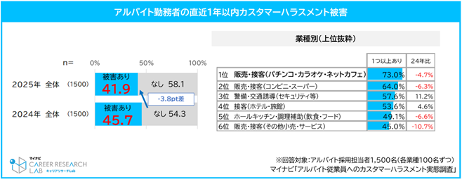 ◆41.9%の企業で、自社のアルバイト従業員が「何らかのカスハラを受けた」。販売・接客業や飲食業では前年から減少傾向