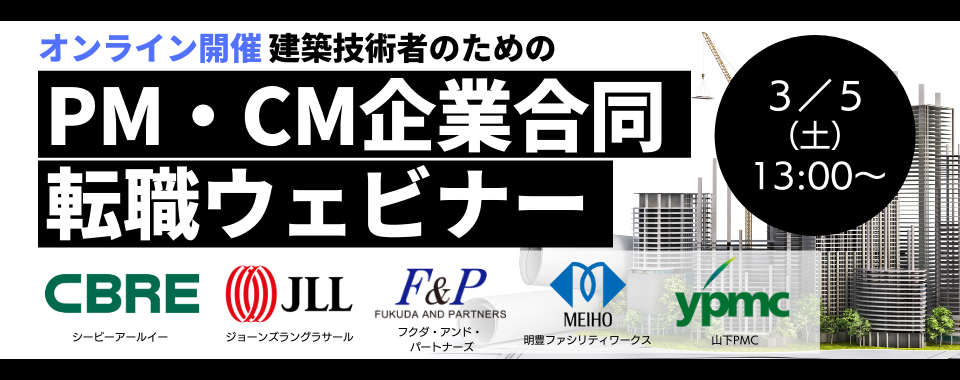 【残席わずか】3/5(土) 建築業界PM・CM企業合同転職ウェビナー開催 ~世界的不動産企業や大手建築コンサルティング企業が集結~