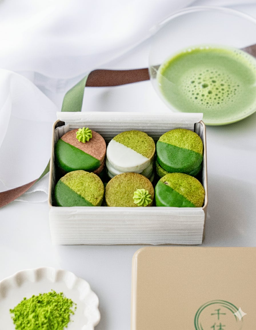 濃厚で華やかなチョコレートの味わいと、旨味たっぷりの千休の宇治抹茶が絶妙に調和した米粉の抹茶クッキー缶です。玉手箱のような茶色の缶に上品な葉っぱの形をした水引をあしらい、贈り物にふさわしい喜ばれる見た目でお届けします。