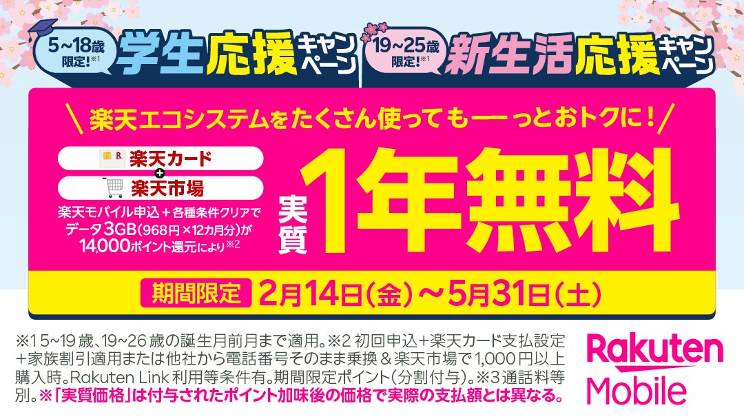 楽天モバイル株式会社(以下「楽天モバイル」)は、本日2025年2月14日(金)から5月31日(土)まで、お子さまのスマホデビューや新生活を応援し、最大14,000ポイント還元する「春の応援」キャンペーン(以下「本キャンペーン」)を実施します。キャンペーン専用サイトまたは「楽天モバイルショップ」において、「Rakuten最強プラン」をご契約した19歳から25歳までのお客様を対象に「新生活応援」キャンペーン、5歳から18歳までのお客様を対象に「学生応援」キャンペーンを実施し、それぞれ最大14,000円相当分の「楽天ポイント」を還元します(注1、2、3、4)。