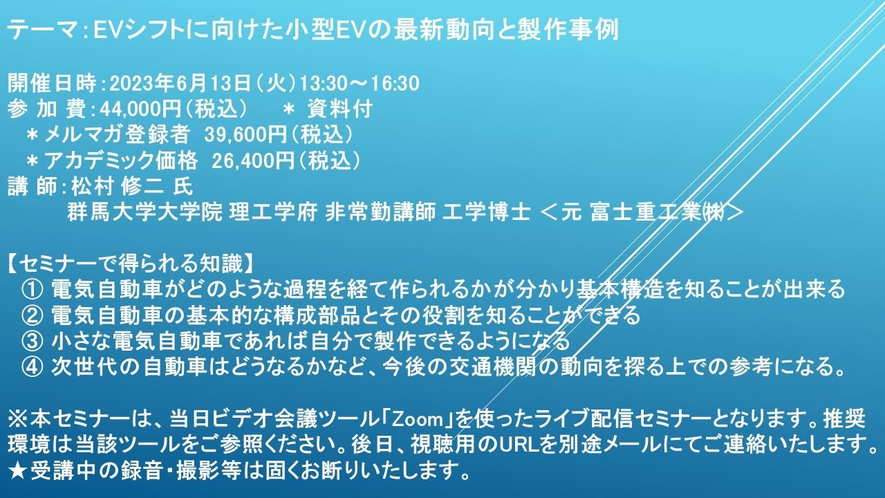 【ライブ配信セミナー】EVシフトに向けた小型EVの最新動向と製作事例 6月13日(火)開催 主催:(株)シーエムシー・リサーチ