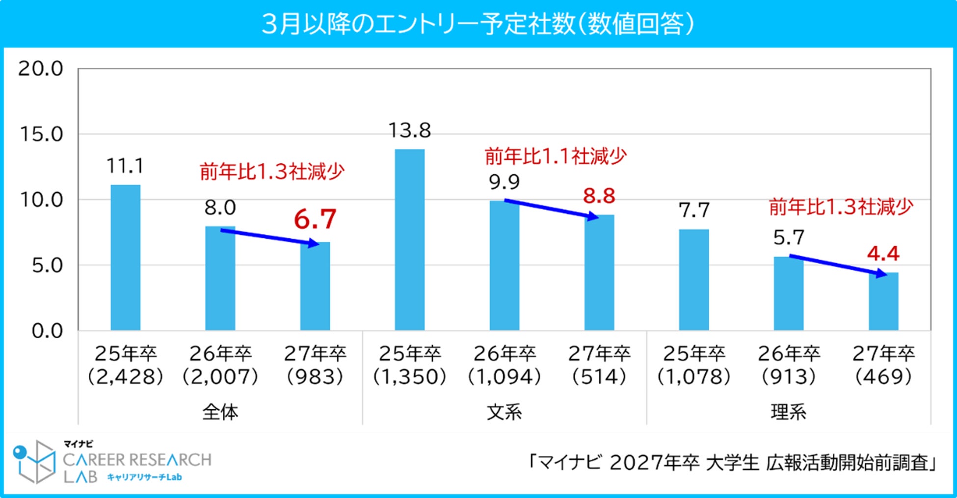 3月以降に企業へエントリーする予定社数を聞くと、全体では6.7社となり、前年から1.3社減少した。文理別では、文系で8.8社(前年比1.1社減)、理系で4.4社(前年比1.3社減)となり、いずれも2年連続で減少となった。インターンシップ等の活動の活発化を背景に、納得の1社を選ぶ「ピンポイント就活」※1の傾向が一層加速しているとみられる。