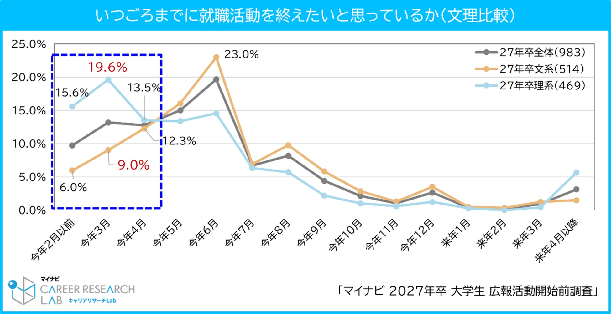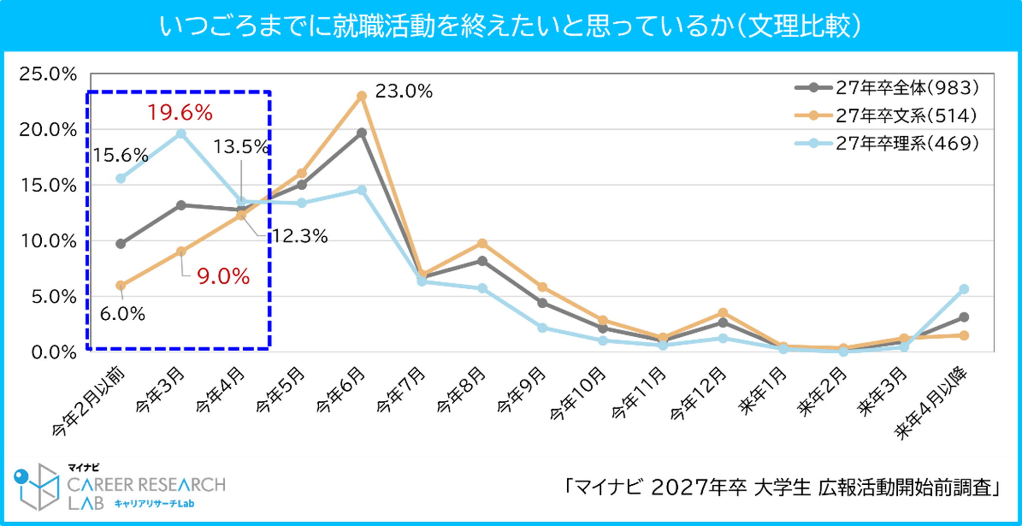 ◆就職活動を終えたい時期は6月が19.7%で最多、理系は3月が最多に