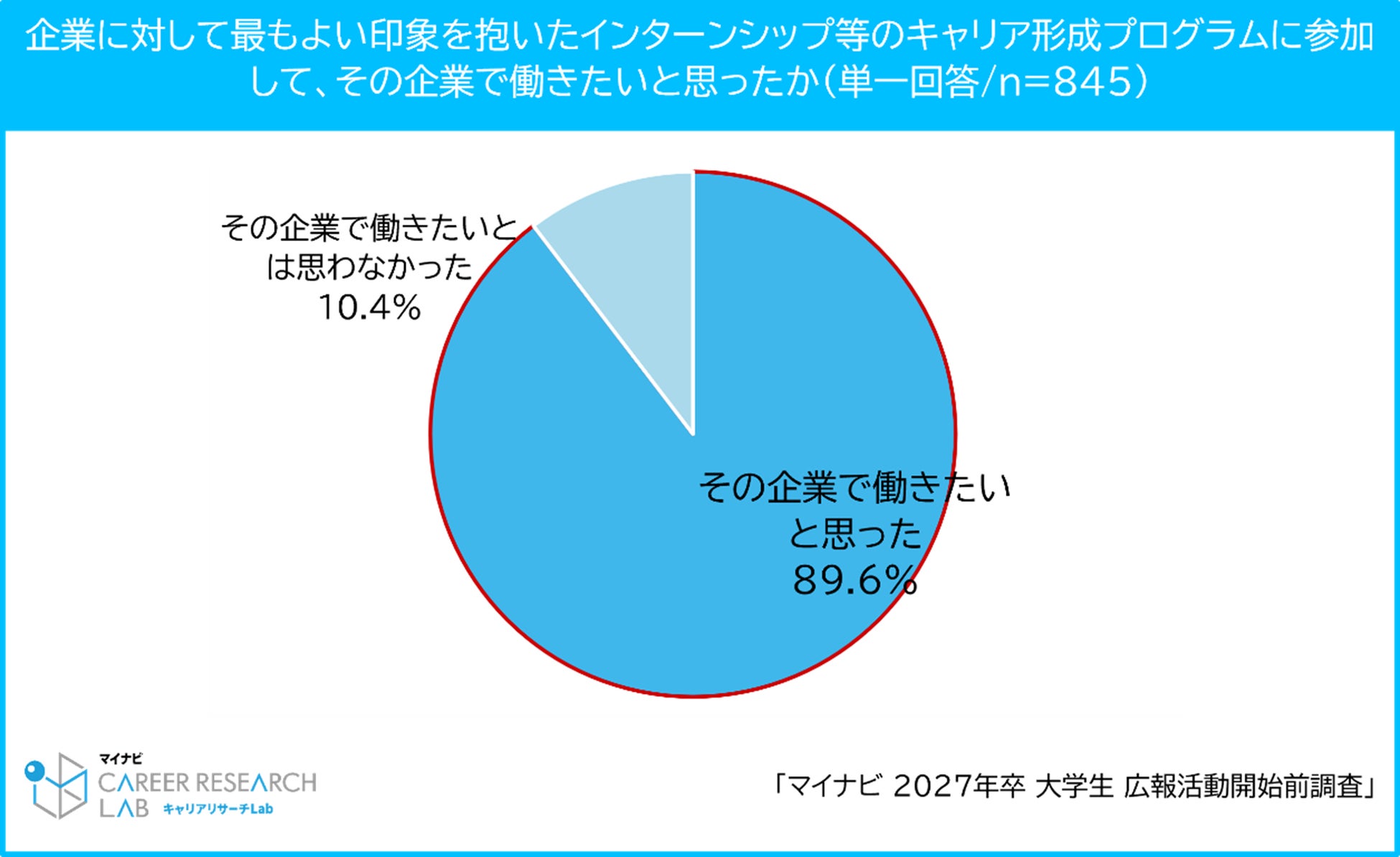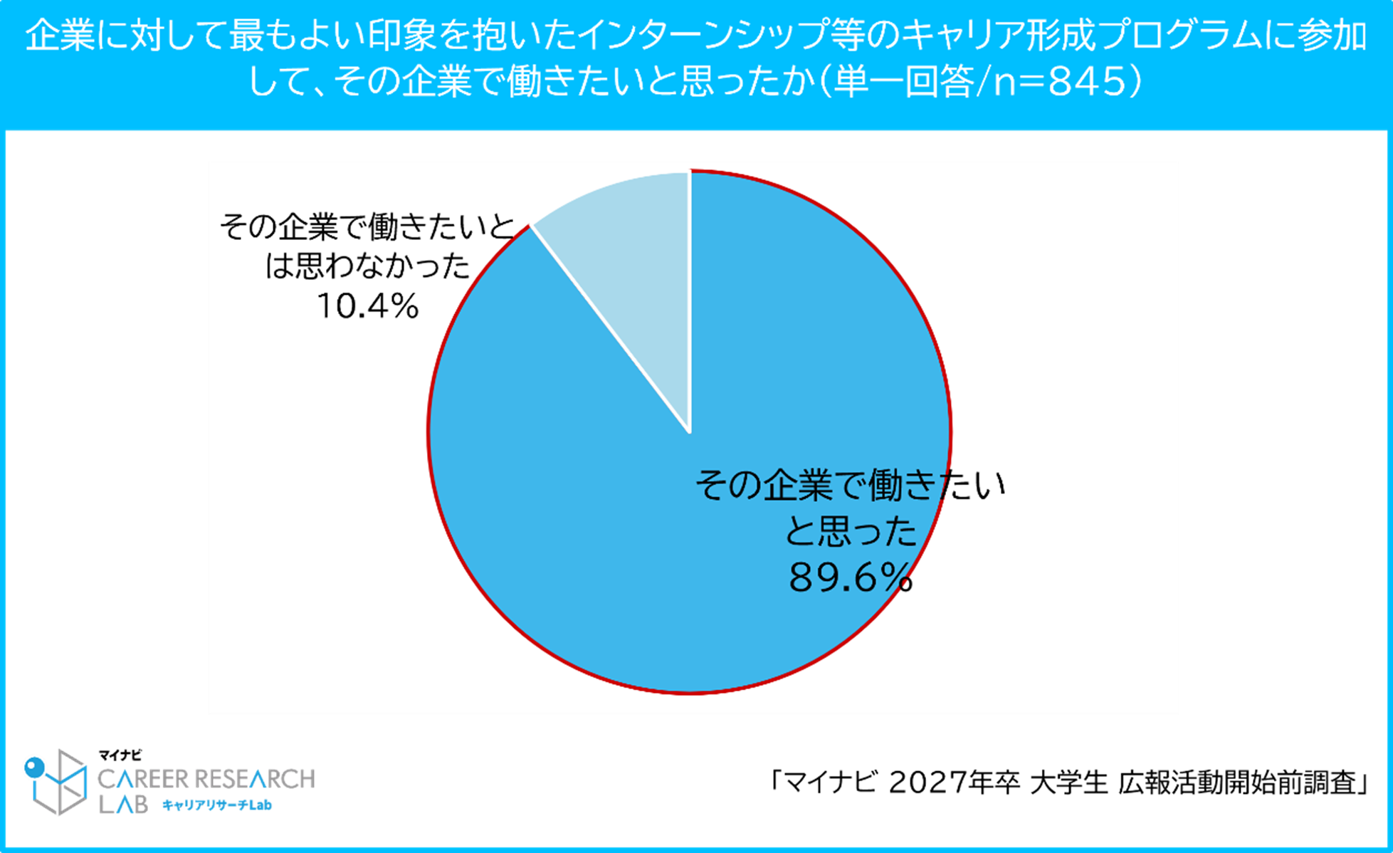 本調査は、3月の企業採用広報解禁を前に、就職活動を間近に控えた学生を対象に実施しました。インターンシップ等のキャリア形成プログラムへの参加率は85.6%と高水準を維持しており、参加後に良い印象を抱いた企業に対しては「その企業で働きたいと思った」と回答した学生が約9割にのぼりました。