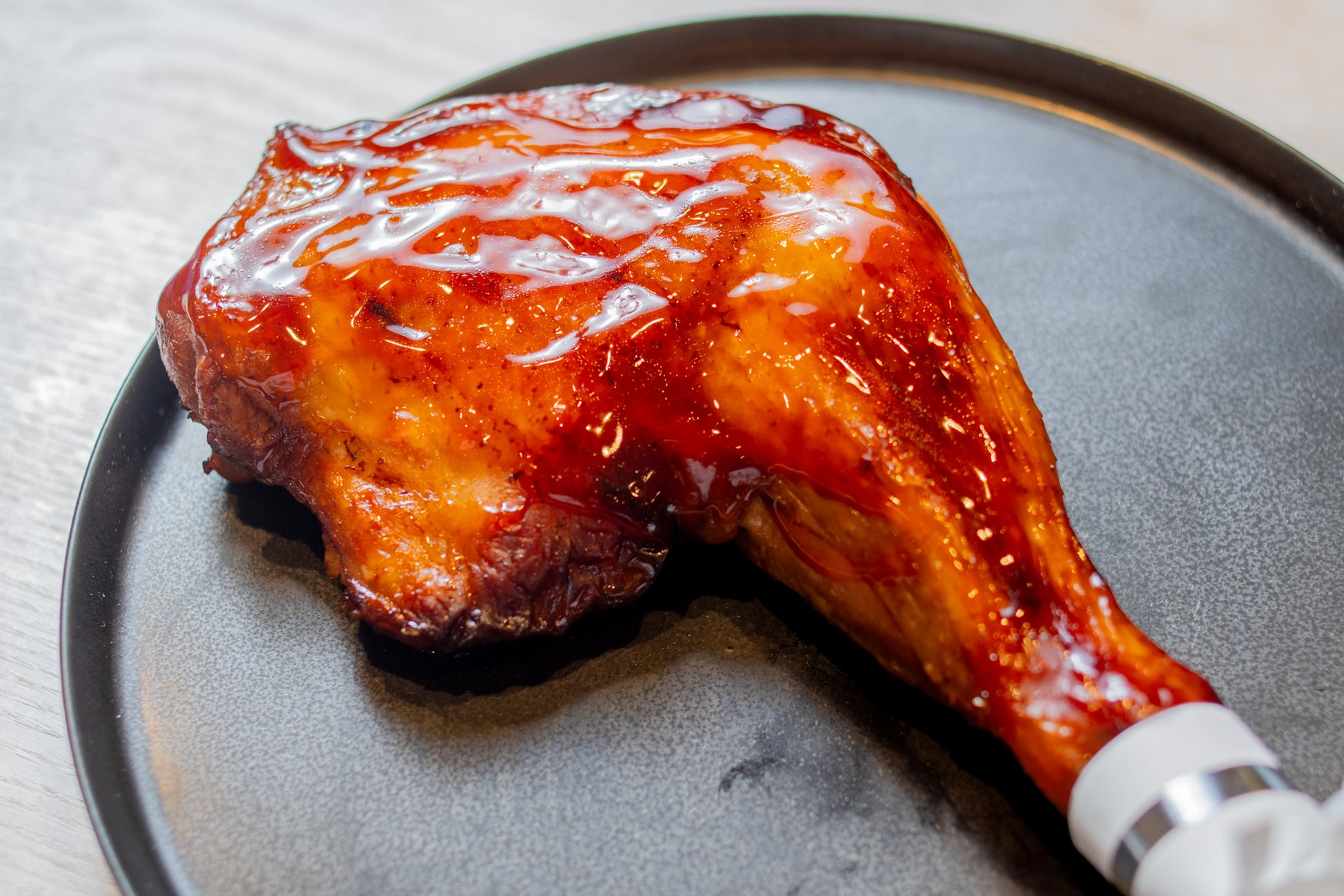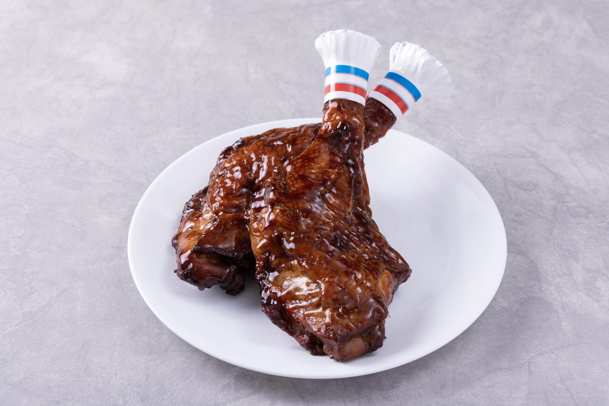 愛知県産「三河赤鶏」の骨付もも肉を使用した照り焼き風味のローストチキンです。