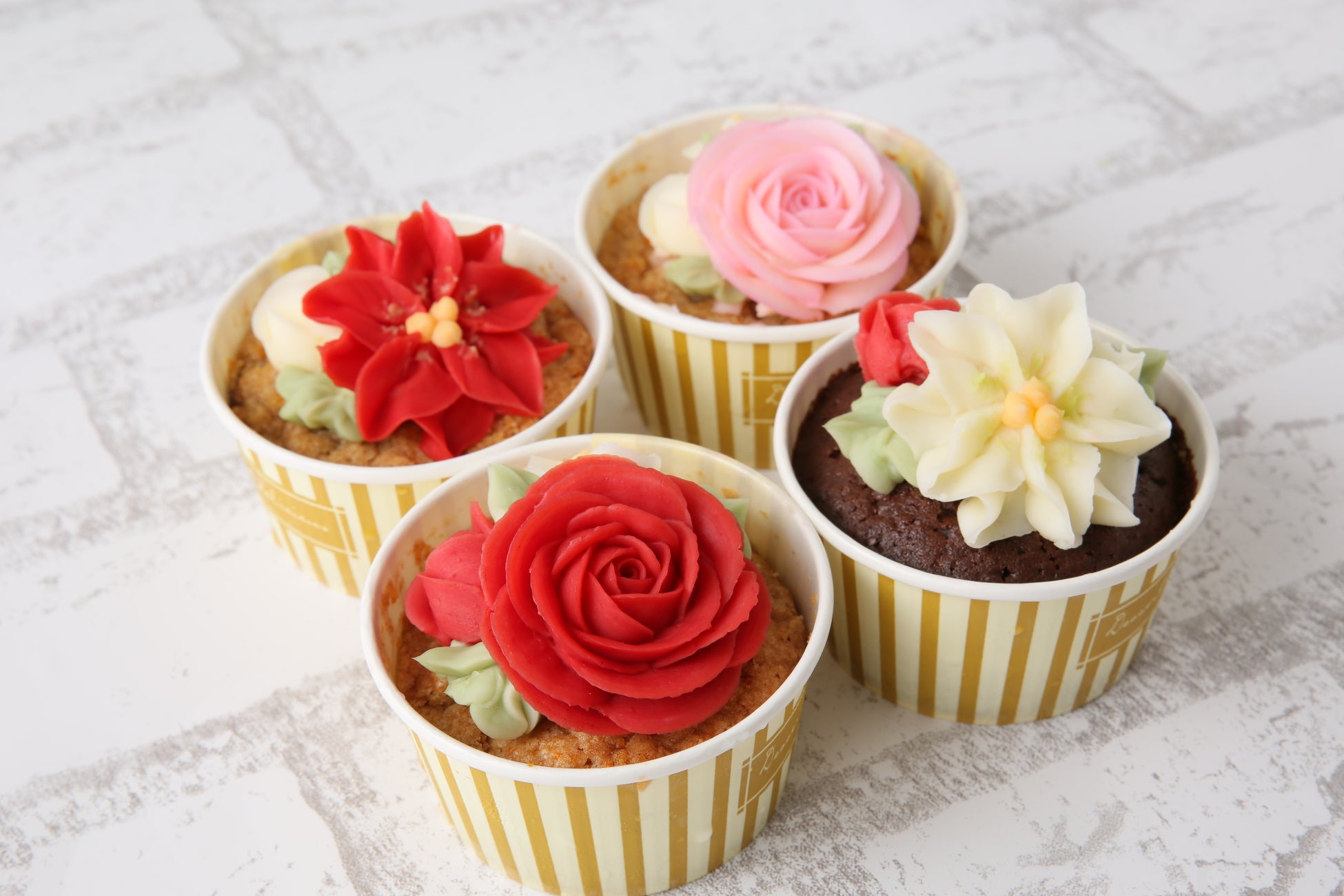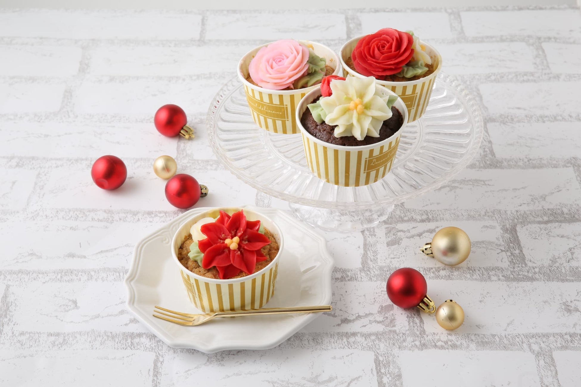 〈Flower Picnic Cafe〉食べられるお花のクリスマスカップケーキ4個セット(ポインセチア)(1箱4個入) 3,500円/1階 和洋菓子イベントスペース