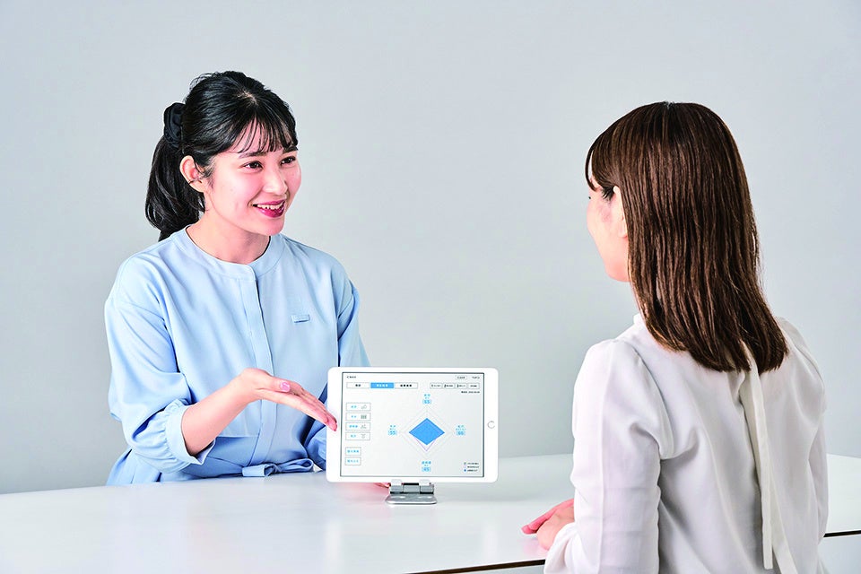 ハンディタイプの肌測定デバイス「スキンカウンセルV」で測定し、コスメデコルテが研究を重ねてきた肌データに基づいて肌状態を解析。蓄積したデータから年代平均と比較でき、客観的な肌状態をお客さまにも共有。測定結果に応じてファンデーションの色選びためのガイドマップも表示され、ベースメイクの色選びに活用できます。