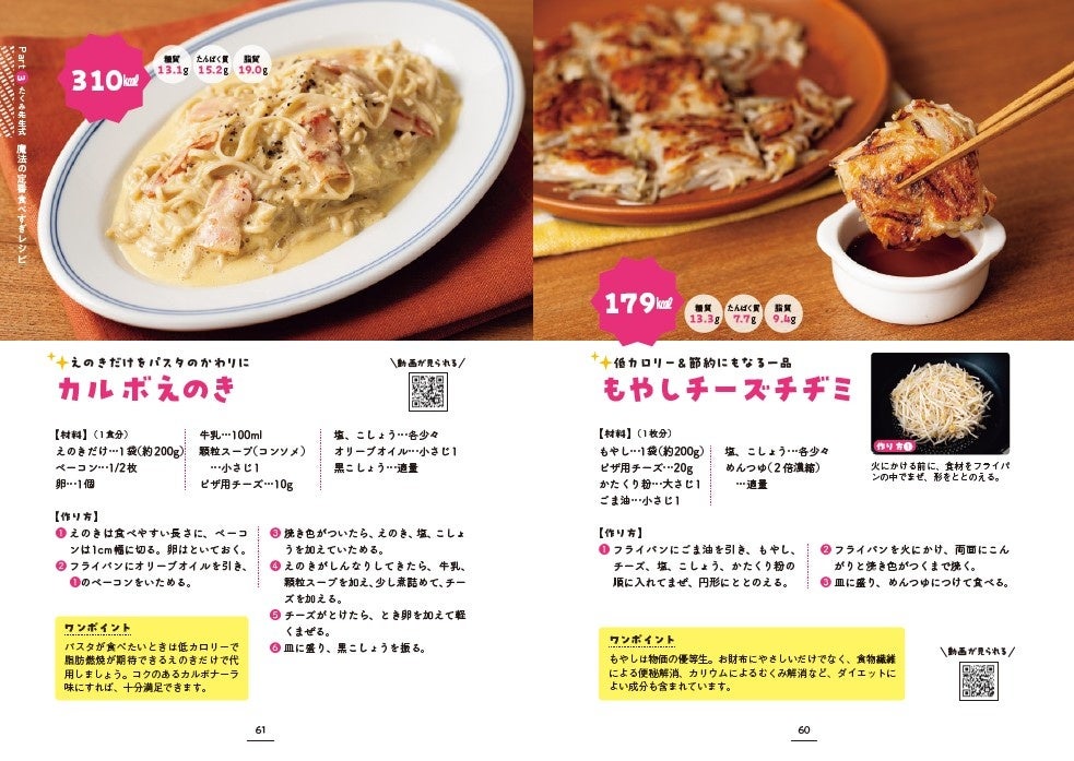 間食だけでなく、主菜、主食にもぴったりの「無限えのき丼」などなど全53品を掲載。