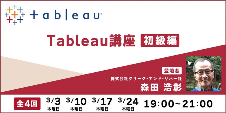 株式会社クリーク・アンド・リバー社(C&R社)は、デジタルマーケティング領域でご活躍中の方やWeb制作関連の仕事に携わる方を対象に、データ分析・可視化ができるビジネスインテリジェンスツール(BIツール)「Tableau」の初級講座を3月3日(木)、3月10日(木)、3月17日(木)、3月24日(木)の全4回にわたり開催いたします。