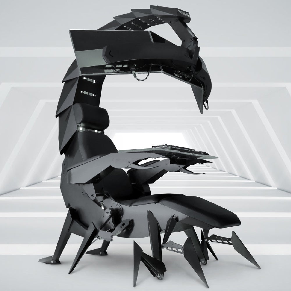 サソリ型の構造をモチーフにした未来的なデザインが最大の特徴で、視覚的インパクトはもちろんのこと、機能面にも優れています。全身を包み込むようなエルゴノミクス設計により、長時間の着座でも疲労感を軽減。視界を遮断しながら集中できる構造は、まるで操縦席にいるかのような没入体験を提供します。
