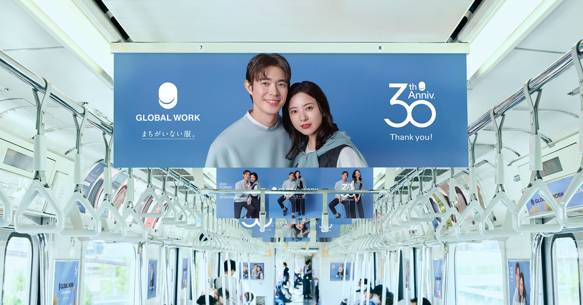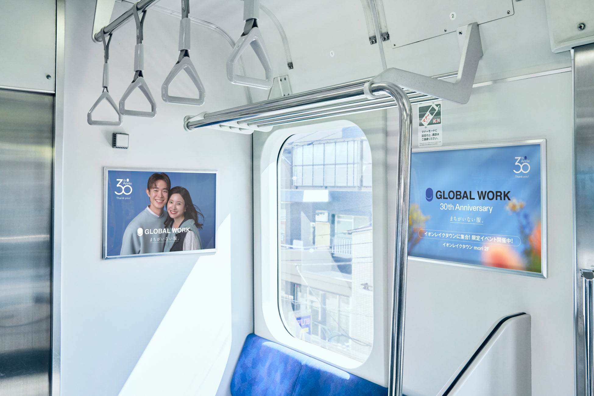 30周年のGLOBAL WORKがJR武蔵野線をトレインジャック! アンバサダーの吉高由里子さん・宮沢氷魚さんビジュアルで埋め尽くされた ”GLOBAL WORKトレイン” を運行!
