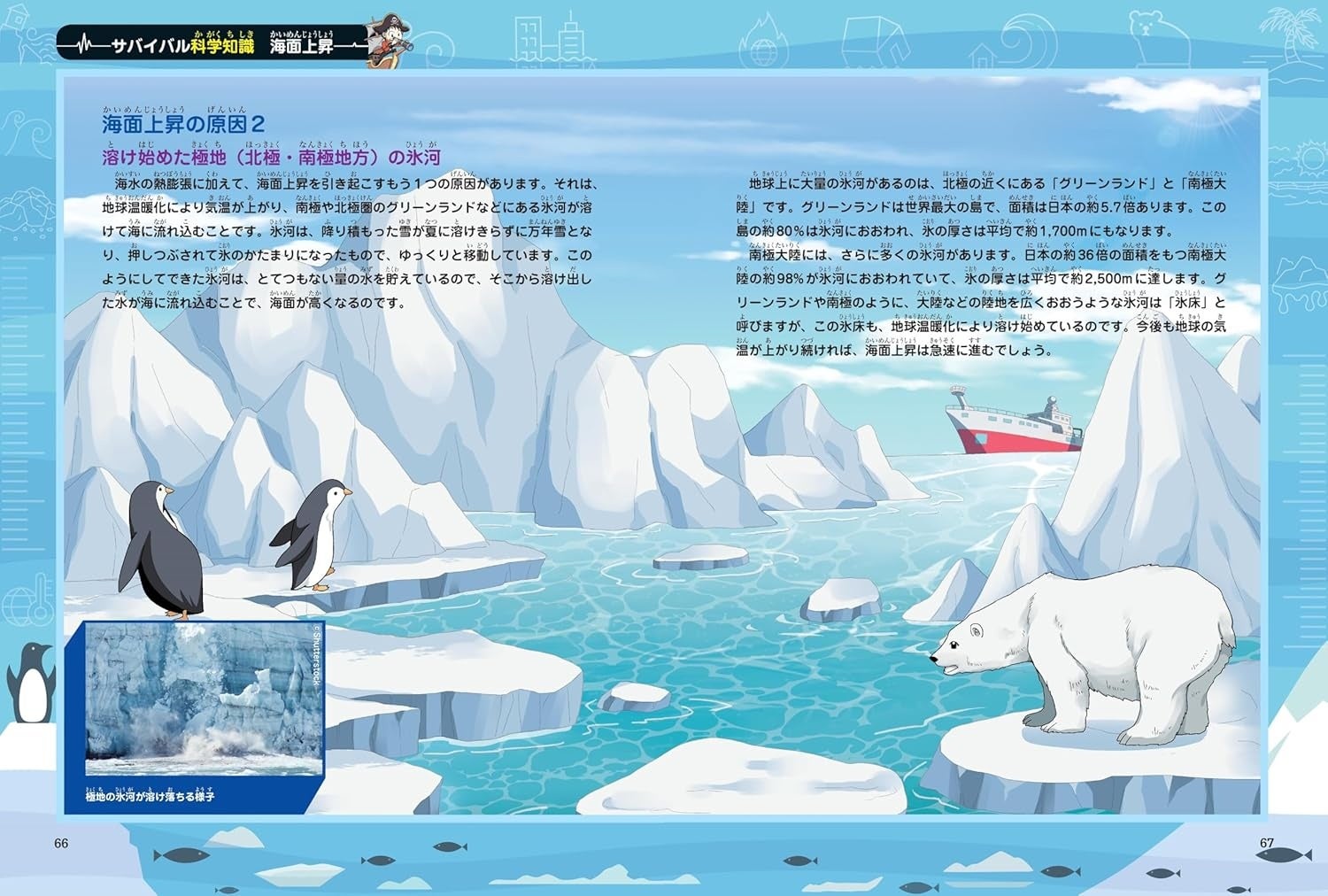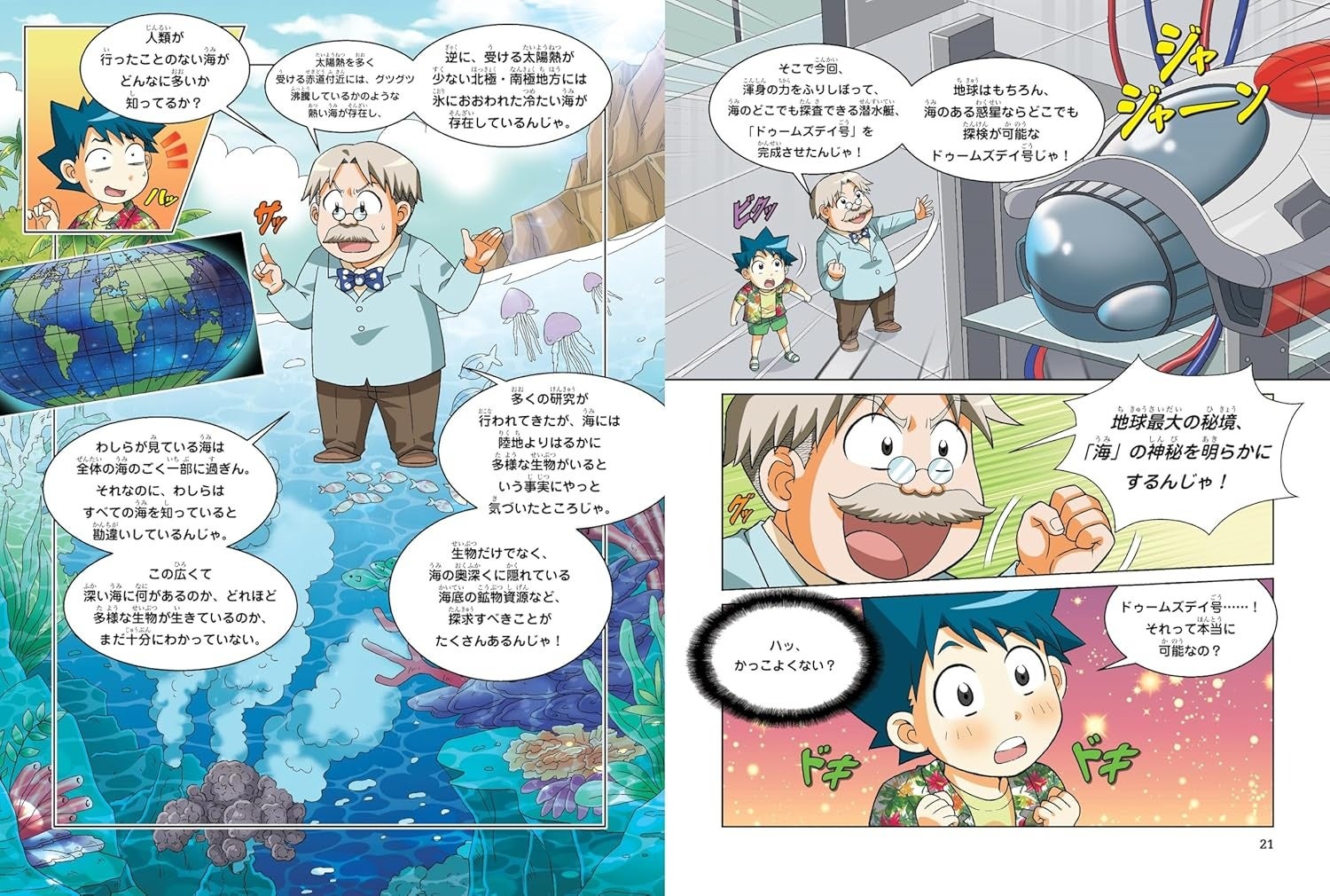 大型客船が竜巻に巻き込まれ、島に漂着したジオたち。島は異常に暑く、植物が枯れたり、雷で火災が起きたりなど異常な様子になっていた。やがて集中豪雨が襲ってきた。地球温暖化の現状や生物への影響、雷や集中豪雨が起きる仕組みなど、楽しみながら気象や地球温暖化についての知識が身につきます。