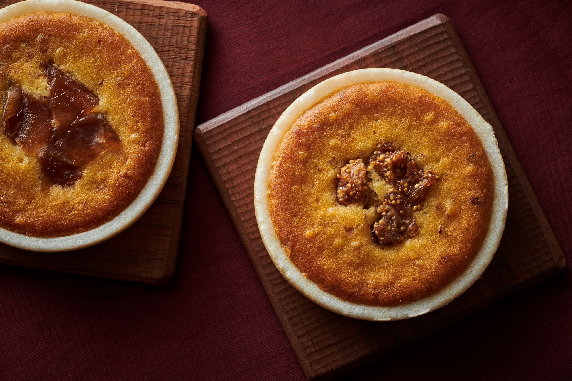 安土桃山時代から続く三重県<柳屋奉善>は、創業当時からの看板商品である最中菓子「老伴(おいのとも)」をアレンジし、地元・三重県産の米粉にメープルシロップを加えた最中をタルトに見立てスイートポテト入りの生地を流して焼き上げた新感覚のお菓子を提案。リンゴとイチジクの2つのフレーバーが楽しめます。